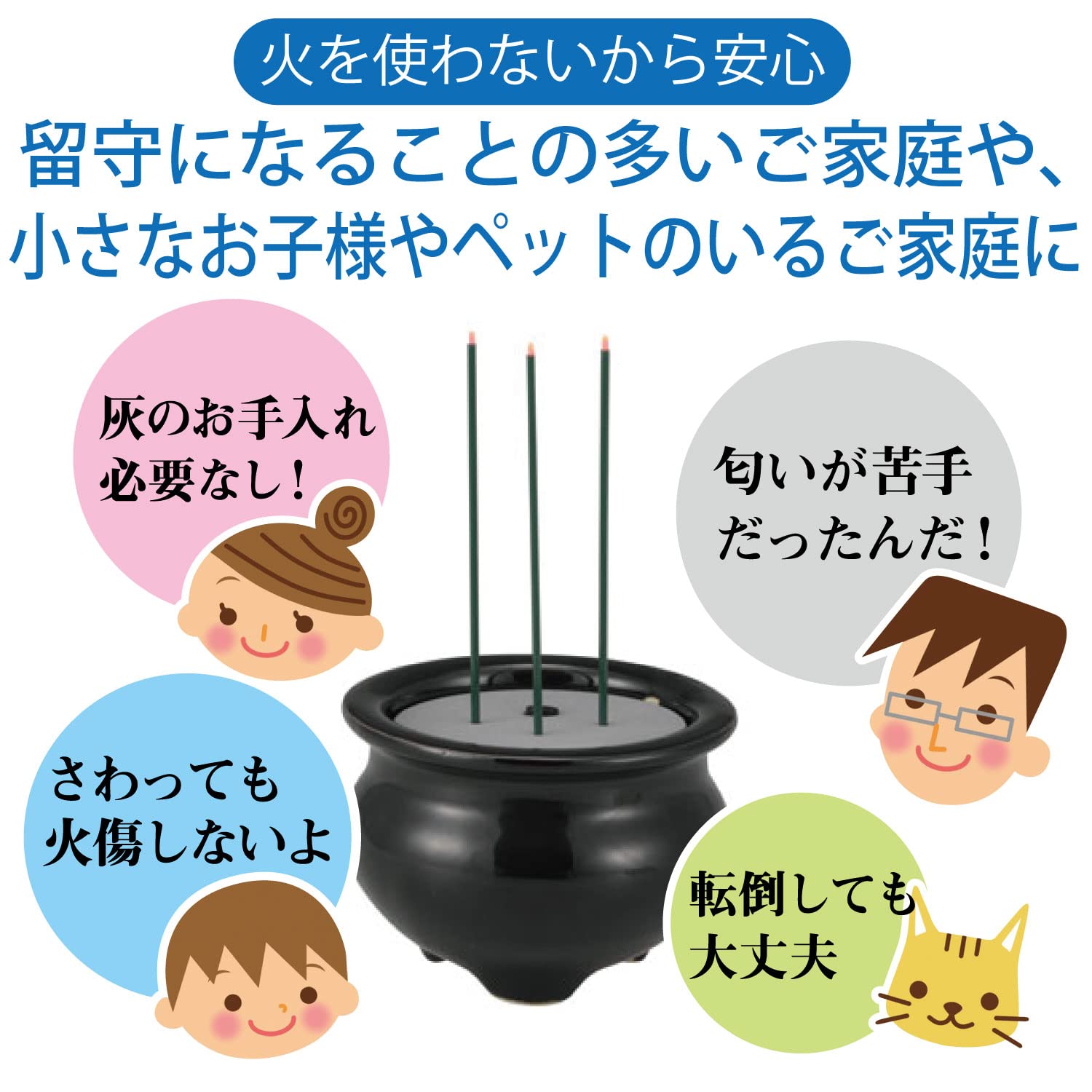 | 付属品: | セット内容:線香台、電子線香(3本)、単4形乾電池(2本・テスト用)、使わない穴に挿入する目隠しスペーサー(2個)、取扱説明書、保証書(保証期間:お買い上げ後6ヶ月) |