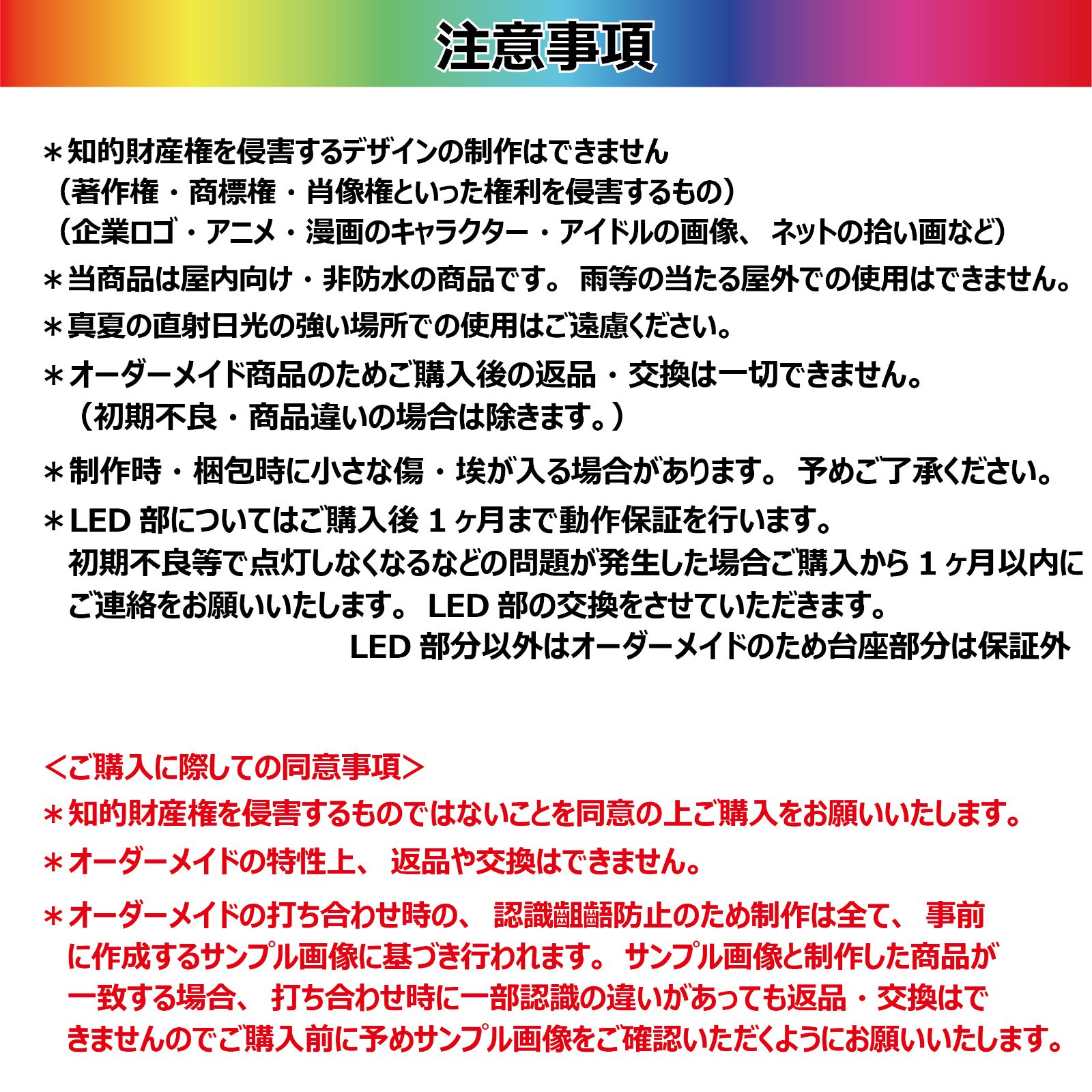 ‼️即購入はご遠慮ください‼️ (当商品はオーダー制のため打ち合わせ後ご購入価格で専用ページをご用意致します。) 弊社では、ステッカーをはじめとしたノベルティーおよびグッズ製作を行っております。 制作や商品の打ち合わせ・お問い合わせは⭕️『質問する』ボタン⭕️よりお願いいたします。お問い合わせを頂けましたらこちらにて質問等の対応や制作の手順のご連絡など丁寧に対応をさせていただきます。 アクリルとテープライトを用いた薄型の電飾看板の製作を行います。 一般的な背面に電球やLED等を配置する看板は厚みが大きいものが多いです。 アクリルの側面から照明を照らし彫刻部分で光を拡散させることでアクリルとテープライト・土台部分の厚みだけで電飾看板が製作可能です。 商品の内容やイメージは画像欄よりご確認ください。 なお、テープライトセットについては単体購入できません。アクリル表示面とセットでのご購入受付となります。 打ち合わせについてはデザインソフトにて作成したデザイン内容をご確認いただき製作内容を明瞭とした上で行います。 アクリル製品については受注状況などによりこちらの商品ページの発送までの日数のとおり2週間程度の日数をいただくことがあります。 【同意事項】 ○知的財産権を有しているデザインの製作は行えません。デザイン確認の際に知的財産権を侵害する可能性がある場合はお客様にご連絡をし確認を行なっております。知的財産権を侵害する製作を行なった場合については当社では一切の責任を負いません。あらかじめご了承ください。 ○ご購入後のデザイン変更は基本的に受け付けておりません。ご購入前にご確認をお願いいたします。 ○制作については最後にご確認いただく最終確認用のサンプル画像に基づいて行われます。打ち合わせの後最終確認用のサンプル画像のデータをそのまま製作部に受け渡しする形となっております。最終確認用のサンプル画像とデザインが違う等での再製作・返品はできませんのであらかじめご確認をお願いいたします。 ○再製作・返品については当社のミスが起因のもののみ受け付けます。「最終確認用のサンプル画像と違うものが届いた」・「枚数が足りない」・「商品がへこんでいた・破れていた」等は再製作・返品が可能ですのでお手数ですが取引メッセージやコメントにてご連絡をお願いいたします。 ○当商品は屋内向けの商品です。屋外での使用については色褪せや部品の劣化などが急速に進行する場合があります。また、屋外での使用における破損や損害等については弊社では対応致しかねますので予めご了承ください。