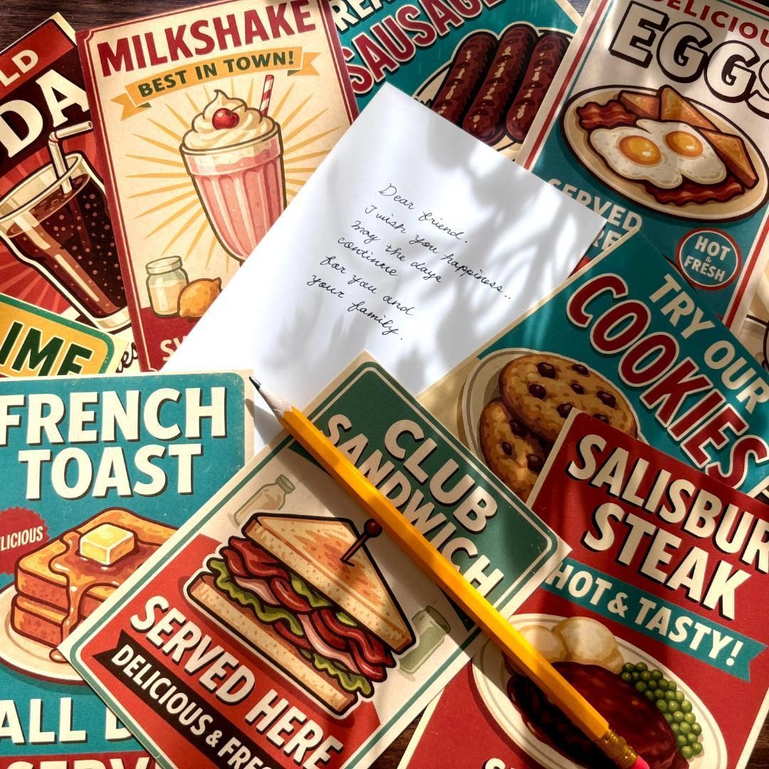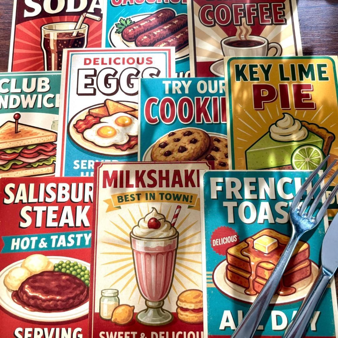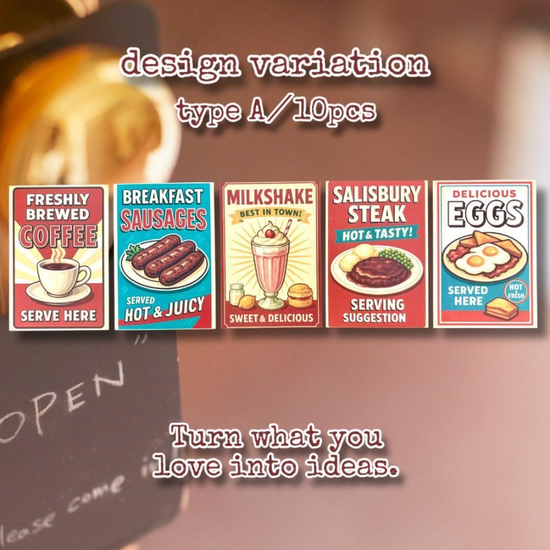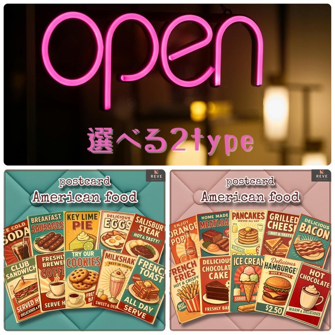 【選べる2種】ポストカード type A アメリカンフード 10枚セット レトロダイナー風デザイン 背景紙 デザインペーパー おしゃれ紙もの インテリア雑貨 壁飾り コラージュ素材 ヴィンテージ看板風 手帳デコ パステルカラー REVEセレクト 323P