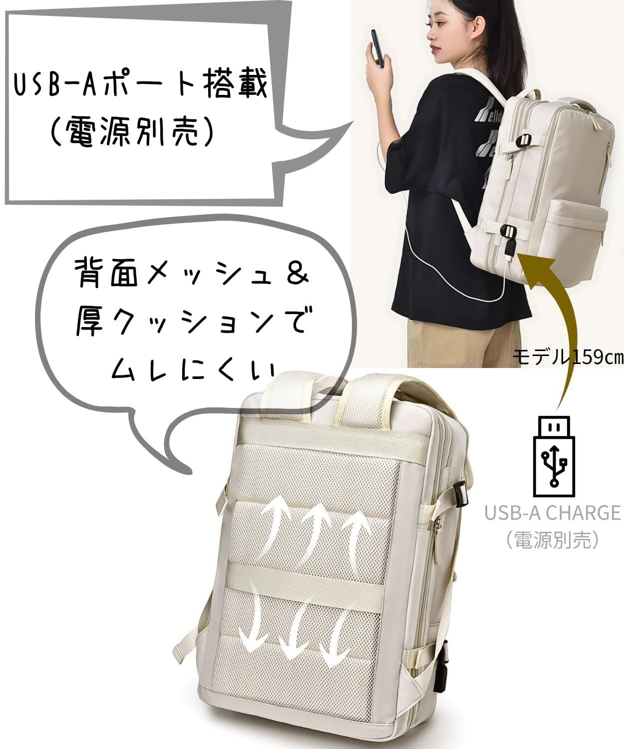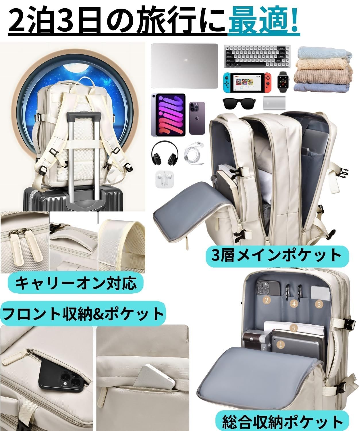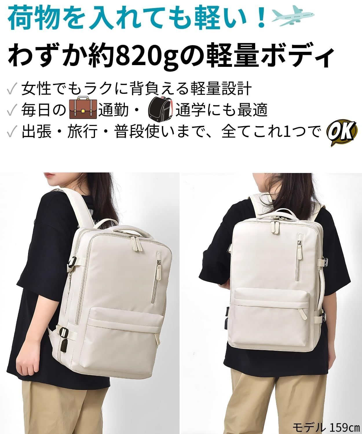 [Ventury] 旅行 リュック 機内持ち込み レディース 軽量 撥水 15.6型PC対応 拡張30L キャリーオン 自立スクエア 通勤 出張 オフホワイト(アイボリー系)