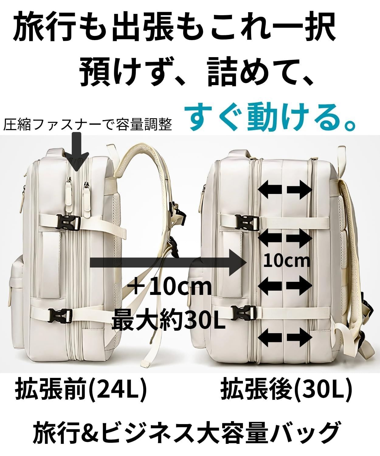 【3層構造&可変容量】PC/ガジェット/衣類を分けて管理できる多ポケット配置。圧縮ジッパーで24L?最大約30Lに容量調整でき、荷物量に合わせて外形の膨らみを最適化。旅行・出張・通学の用途切替が簡単で、整理整頓が苦手でも迷子になりにくい設計。