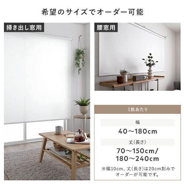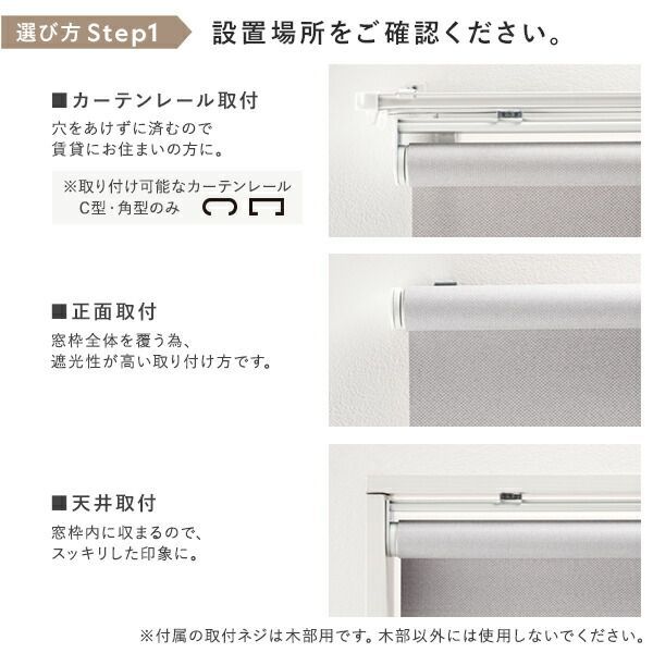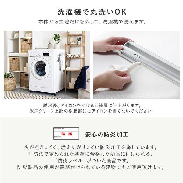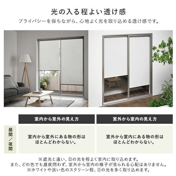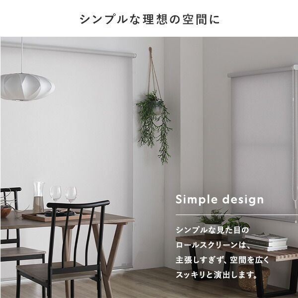 ※代引き不可同梱不可 ※北海道、沖縄、離島送料は別途お見積り。 ※手配完了後は、ご注文キャンセルを承る事が出来ません。 指定日可能の表示以外の商品はご指定日不可です。 ※代引き不可同梱不可 ※北海道、沖縄、離島送料は別途お見積り。 ※手配完了後は、ご注文キャンセルを承る事が出来ません。 指定日可能の表示以外の商品はご指定日不可です。 ■サイズ・色違い・関連商品 関連商品の検索結果一覧はこちら ■商品内容 理想のシンプルな暮らし ・賃貸もOK!簡単取付 ・柔らかく上質な織生地 ・日本製で安心の品質と機能性 ・カーテンレール取り付け可 ■賃貸OK!カーテンレールに取り付け可 届いてすぐ使える。カーテンレールに取り付けできるワンタッチ式 ・カチッとはめ込むだけ ・カーテンレール取付用の金具が付属 ・通常の天井付け、正面付けにも対応 ■柔らかく上質な織生地 ノン樹脂加工で柔らかく、織り目の美しい上質な生地を使用。 外から見ても高級感があります。 ・防炎 ・洗濯可 ■洗濯機で丸洗いOK 本体から生地だけを外して、洗濯機で洗えます。 ・脱水後、アイロンをかけると綺麗に仕上がります。 ※スクリーン上部の樹脂部にはアイロンを当てないでください。 ・安心の防炎加工 火が点きにくく、燃え広がりにくい防炎加工を施しています。 消防法で定められた基準に合格した商品に付けられる、「防炎ラベル」がついた商品です。 防災製品の使用が義務付けられている建物でもご使用頂けます。 ■シンプルな理想の空間に シンプルな見た目のロールスクリーンは、 主張しすぎず、空間を広くスッキリと演出します。 ■光の入る程よい透け感 プライバシーを保ちながら、心地よく光を取り込める透け感です。 室内から室外の見え方:室内から室外にある物の形はほとんどわからない。(昼間/夜間) 室外から室内の見え方:室外から室内にある物の形はほとんどわからない。(昼間/夜間) ※遮光と違い、日の光を程よく室内に取り込めます。 また、どの色でも昼夜問わず、室外から室内の様子が見られる心配はありません。 ※ホワイトや淡い色のスクリーン程、日の光を多く取り込めます。 ■省エネで一年中快適に 熱気や冷気を防いでくれるので、冷暖房効果も上がり電気代の節約にも。 ■軽く、快適な使い心地 サイドのチェーンは軽い力で昇降できます。 ・操作位置(チェーン)は右側になります。 ・日本品質 内蔵されたバネにより、軽い力で巻き上げ可能。 国内メーカーならではの快適な使い心地です。 ■カーテンとも高相性 柔らかい質感で、表情がある織り生地なので、 カーテンと合わせやすく馴染みます。 ■いろんな場所の目隠しとして 本棚やキッチン収納の目隠しにも。 スッキリと生活感を隠します。 ・ランドリールーム 洗剤などの日用品をスマートに隠します。 ・リビング 階段やお部屋の間仕切りにも使えます。 ■老舗メーカーの日本のモノづくり ・TOSO1年保証 ・日本製 当商品は、半世紀以上、窓周りの商品を製造、販売する老舗メーカー(TOSO)が手掛けています。 歴史の中で積み重ねた高い技術を持つ、日本の厳しい品質基準に対応した国内工場で生産。 高い品質、暮らしに寄り添った機能、良質なデザインで安心して長くご使用いただけます。 ■お子様にも安心の安全設計 お子様の手の届かない位置に、チェーンを束ねておく為の「コードグリップ」を付属しております。 ・低ホルムアルデヒドF☆☆☆☆認定品 ホルムアルデヒド放散速度の基準値を満たした認定品の生地を使用。 安心してお使い頂けます。 ■細部まで美しく ・ウェイトバーは、生地で包みフラットな印象に。 ・上部の部品カラーはお部屋に合わせやすいホワイト。(全色共通) ■希望のサイズでオーダー可能 ・1枚あたり 幅:40〜180cm 丈(長さ):70〜150cm/180〜240cm ※幅10cm、丈(長さ)は20cm刻みでオーダーが可能です。 ■お部屋に馴染みやすい3color ・Whiteホワイト ・PinkWhiteピンクホワイト ・Mediumgrayミディアムグレー ■選び方Step1設置場所をご確認ください。 ・カーテンレール取付 穴をあけずに済むので賃貸にお住まいの方に。 ※取り付け可能なカーテンレール:C型・角型のみ ・正面取付 窓枠全体を覆う為、遮光性が高い取り付け方です。 ・天井取付 窓枠内に収まるので、スッキリした印象に。 ※付属の取付ネジは木部用です。木部以外には使用しないでください。 ■選び方Step2窓の寸法を測りサイズを決めます。 ・カーテンレール付けの場合 幅は窓枠の外寸以上、丈はカーテンレールの位置から 窓枠の外側寸法以上の製品サイズでご注文下さい。 ※mm単位は切り上げてください。 ・正面付けの場合 幅・丈ともに窓枠の外側寸法以上の製品サイズでご注文下さい。 ※mm単位は切り上げてください。 ・天井付けの場合 幅・高さは窓枠の内側寸法から1cm以上差し引いた寸法を参考にご注文下さい。 ※1cm未満は切り捨ててください。 ・Check! ロールスクリーンは上部で巻き取られる為、 少し長めの丈設