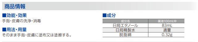 日本薬局方エタノール:83mL、日本薬局方 精製水:適量/薬液100mL中