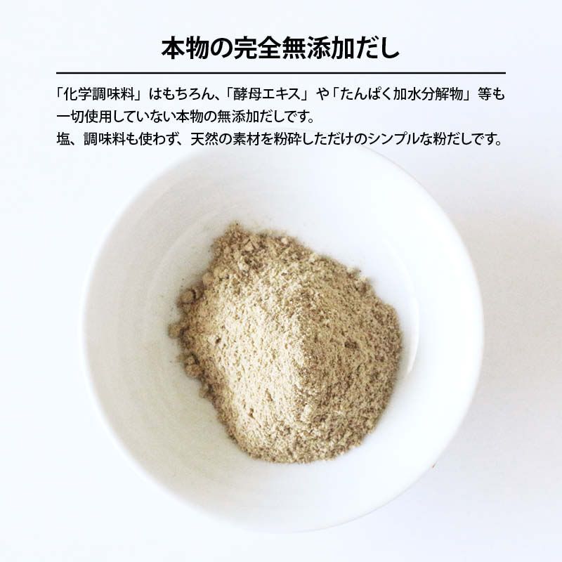 塩、調味料も使わず、天然の素材を粉砕しただけのシンプルな粉だしです。