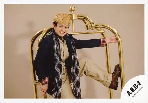 【中古】生写真(ジャニーズ) A.B.C-Z/塚田僚一/横型・膝上・衣装黒ベージュ・赤チェック柄・ストール・両手金のオブジェ・左足上げ・体右向き・目線左下・歯見せ・背景ベージュ/公式生写真