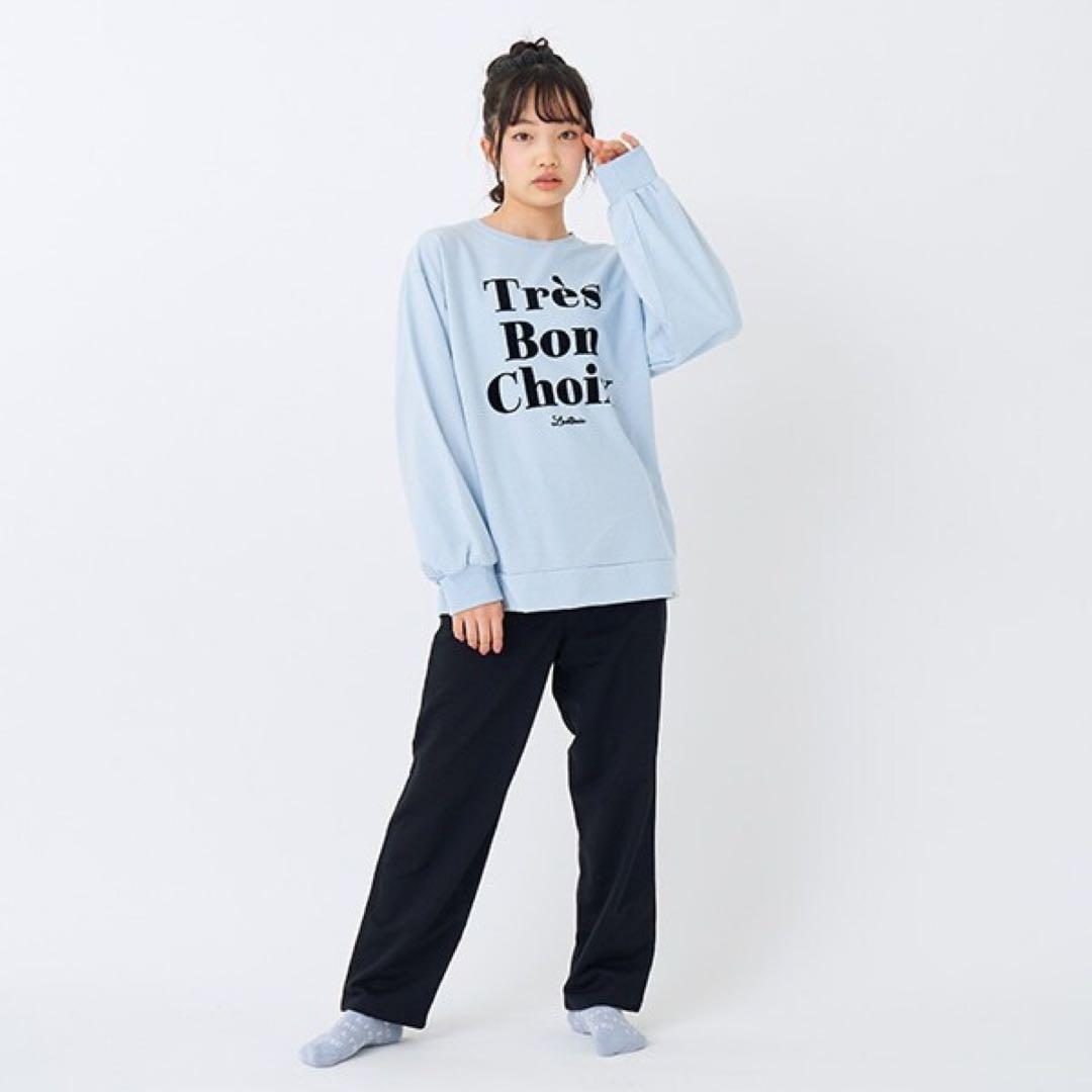 大胆なフロントプリントがアイキャッチのトレーナーと、ワイドシルエットのパンツを組み合わせました。