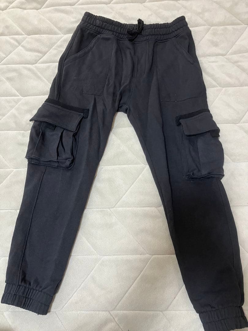 カーゴデザインのスウェット素材のブラックパンツ、サイドポケット付きで機能的。 昨年購入し、1シーズン使用しました。 使用回数は少ないですが、使用感はあります。 黒なのでよく見るとシミがあります。(写真5、6枚目) 股下約49センチです。 - カラー: ブラック - デザイン: カーゴパンツ - ポケット: サイドポケット付き - ウエスト: ゴムウエスト - スタイル: スリムフィット ご覧いただきありがとうございます。
