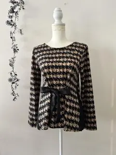 ハウンドトゥース柄長袖チュニック/カットソー/切り替えデザイン