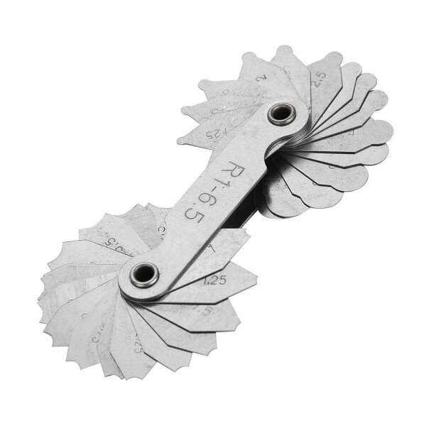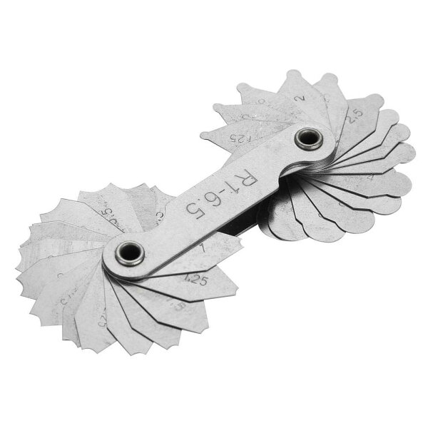 ## 簡単に使えるデザインこのラジアスゲージには、凸面と凹面の両方を測定できるデザインが採用されています。これにより、さまざまな形状の物体を簡単に測定できます。工具や金型メーカーにとって、作業の中で正確な測定を行うことは非常に重要です。