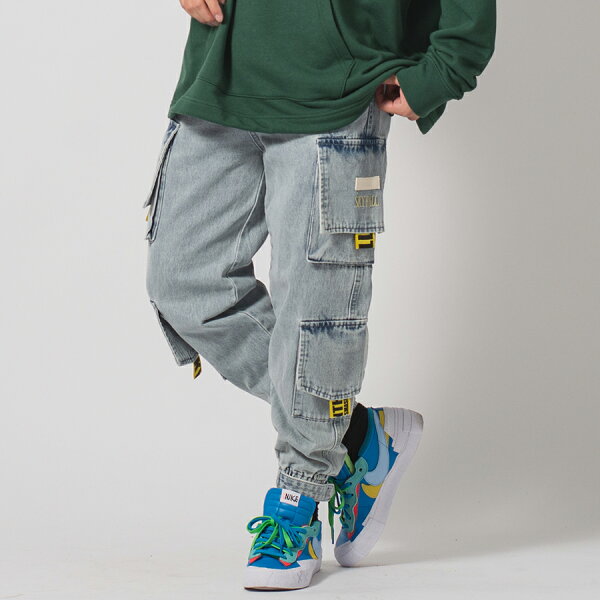 デニムカーゴジョガーパンツ カーゴパンツ メンズ ワイドパンツ ジーンズ デニムパンツ 太め 韓国ファッション ビッグシルエット ストリート系 ルーズシルエット サックスブルー ブラック ホワイト 白 紺 青 黒 S M L RE730 セブンサーティー