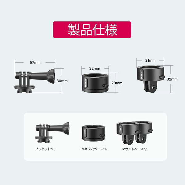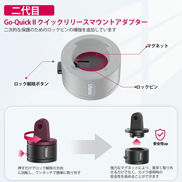 従来のulanzi GP-4クイックリリースマウントアダプターと比較して、保護のためのロックピンの補強を追加しています。非常に小型で取り付けも簡単、インターフェイスロックボタンを押すことで、素早く分解が可能です。Gopro接続用ブラケットはカメラを装着する際、カメラ本体に干渉することはありません。