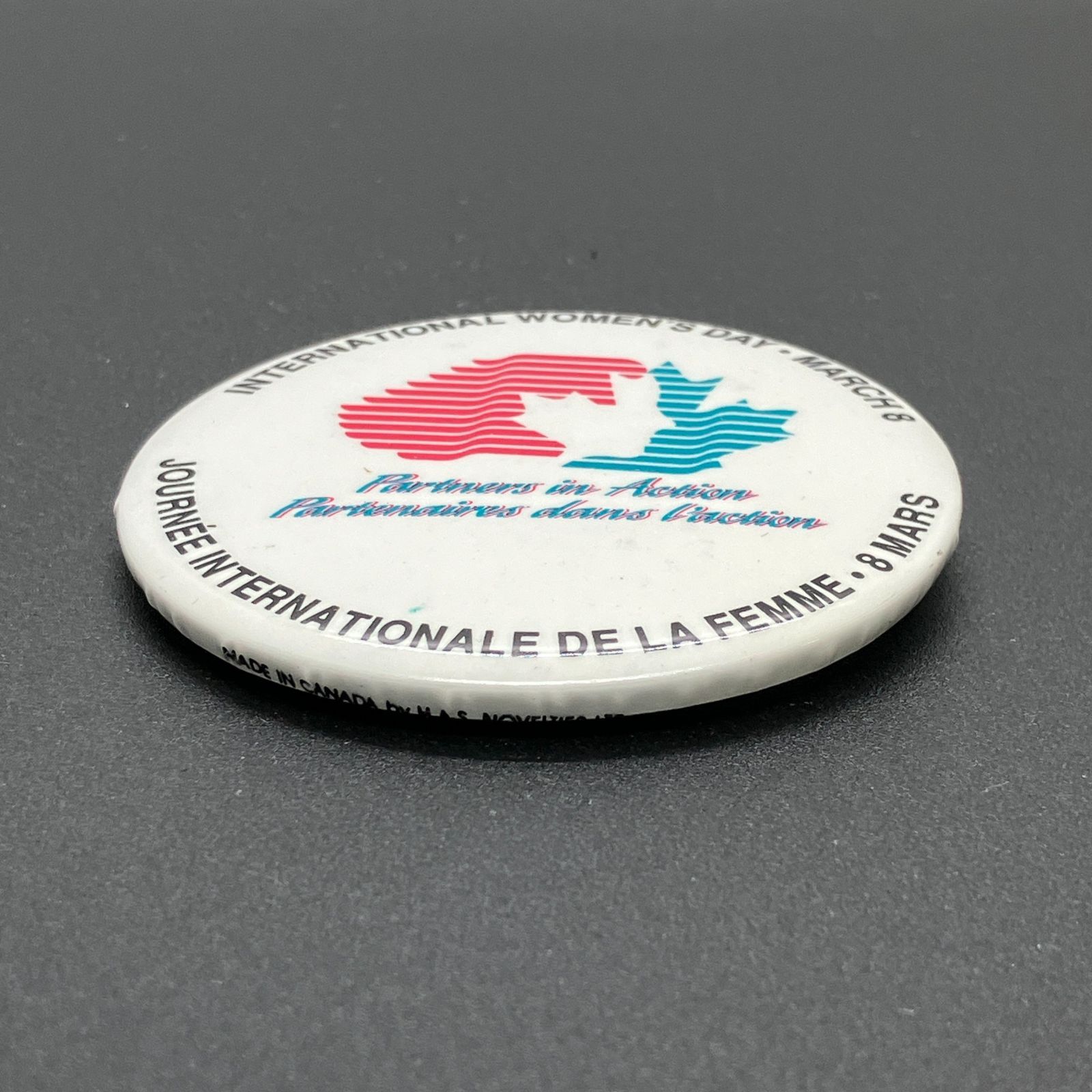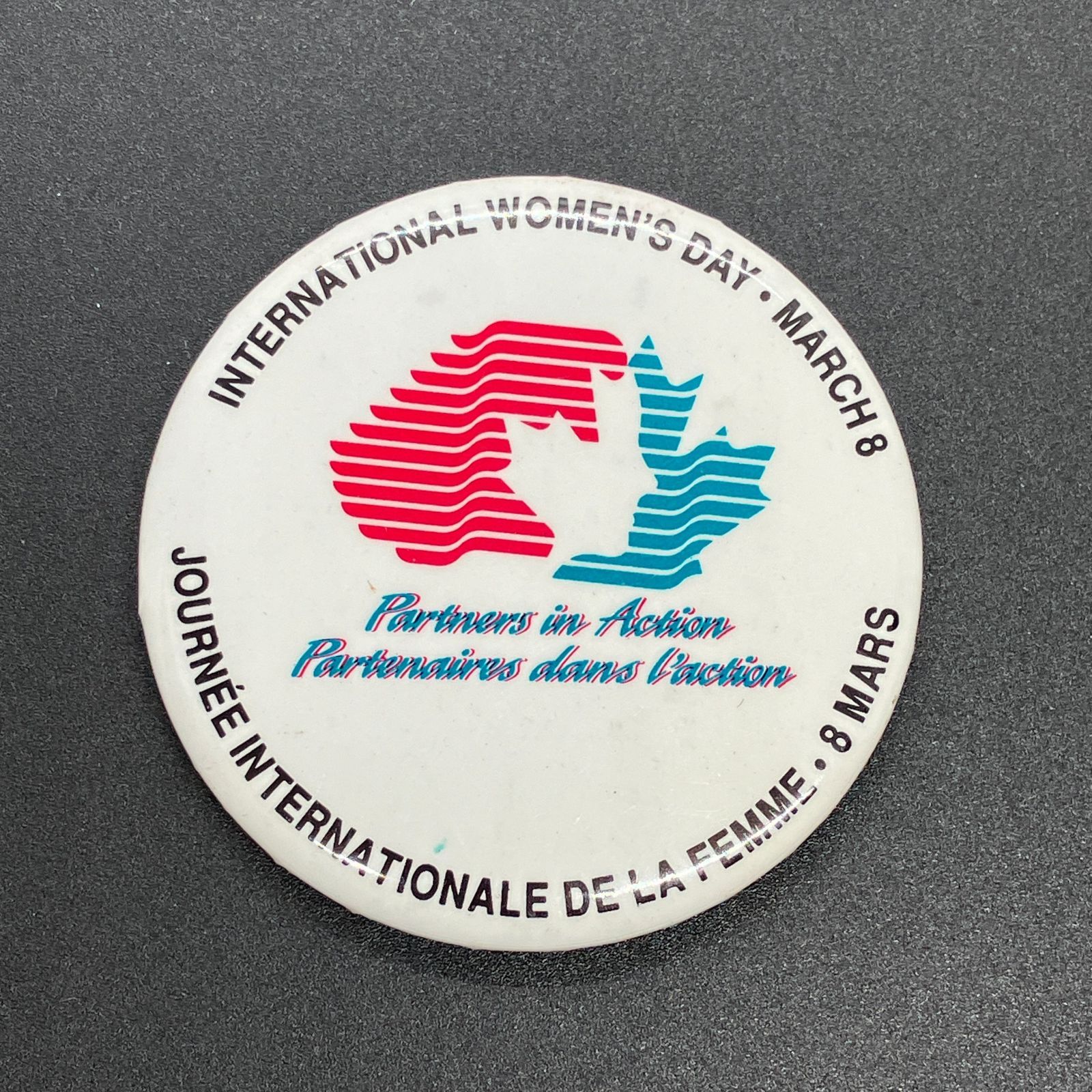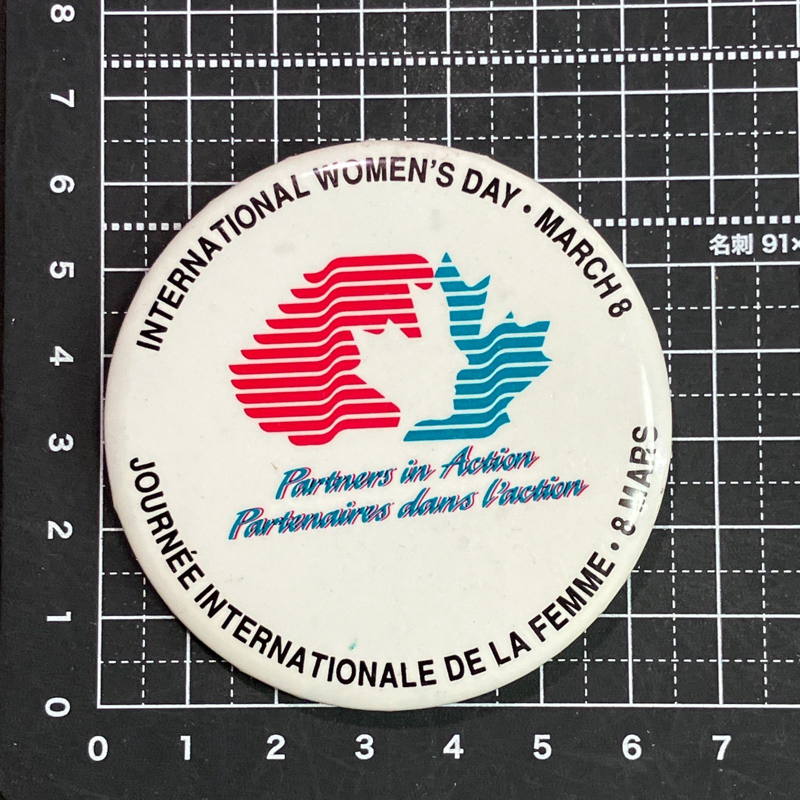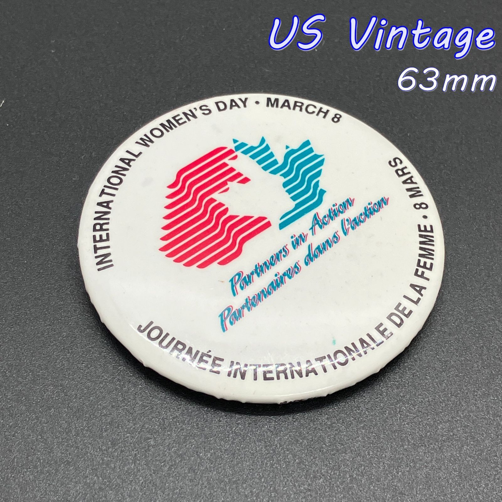 缶バッジ アメリカ 輸入 雑貨 ビンテージ 『 インターナショナルウィメンズデー 3月8日パートナーズ 』 当時物 ヴィンテージ バッチ ピンバッチ ※ メッセージ ノベルティー 広告 レトロ ( BAT2030 )