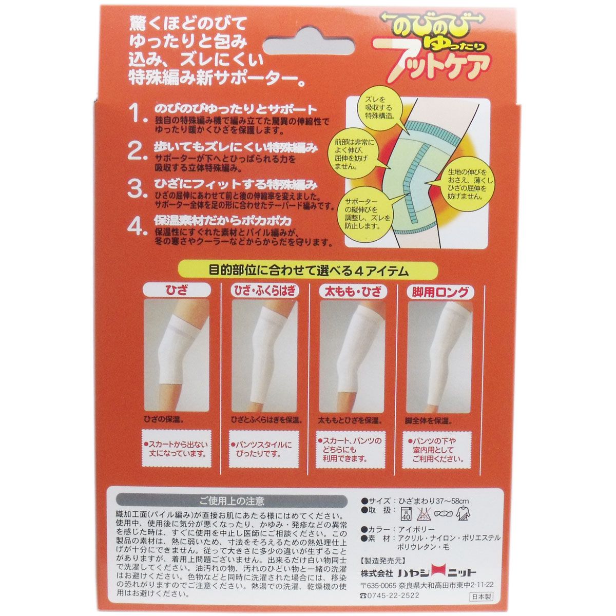 -------------------- こちらの商品は 沖縄・離島への配送ができません。 -------------------- -------------------- 10時ごろまでの受付で翌1営業日ごろまでに発送予定 *営業日:土日祝日を除いてカウントしてください *受付時間は10時から17時となっております -------------------- 筋肉、関節の痛みに'遠赤外線繊維使用'のサポーター 驚くほどのびて、ゆったりと包み込み、しかもズレない特許編みサポーター 1.のびのびゆったりとサポート ・独自の特許編み機で編み立てた驚異の伸縮性で、ゆったり暖かくひざを保護します。 2.歩いてもズレない特許編み ・サポーターが下へとひっぱられる力を吸収する特許編み。 ひざの屈伸にズレません。 3.ひざにフィットする特殊編み ・ひざの屈伸に合わせて前と後の伸縮率を変えました。 サポーター全体を足の形に合わせたテーパード編みです。 4.保温素材だからポカポカ ・保温性にすぶれた保温素材糸とパイル編みが、冬の寒さやクーラーなどから、からだを守ります。 個装サイズ:130X190X40mm 個装重量:110g 内容量:1枚入 製造国:日本 【発売元:株式会社ハヤシ・ニット】 【サイズ】 フリー 【カラー】 アイボリー 【素材】 アクリル、ナイロン、ポリエステル、ポリウレタン、毛 【注意】 ・織加工面が直接お肌にあたるようにはめてください。 ・使用中、使用後に気分が悪くなったり、かゆみ・発疹などの異常を感じた時は、すぐ使用を中止し医師にご相談ください。 ・本製品の素材は熱に弱いため、寸法をそろえるための熱処理仕上げが充分にできません。 従って大きさに多少の違いが生じることがありますが、着用上問題ありません。 ・できるだけ白いもの同士で洗濯してください。 注意事項 予告なく成分・パッケージが変更になることがございます。 予めご了承ください。 *予告なく成分・パッケージが変更になることがございます。予めご了承ください *ダンボールを使用して発送する場合には、入数以下の個数の場合、 中古ダンボールを使用する場合があり、ご注文の商品とは異なるダンボールになる場合があります。 あらかじめ、ご了承ください。