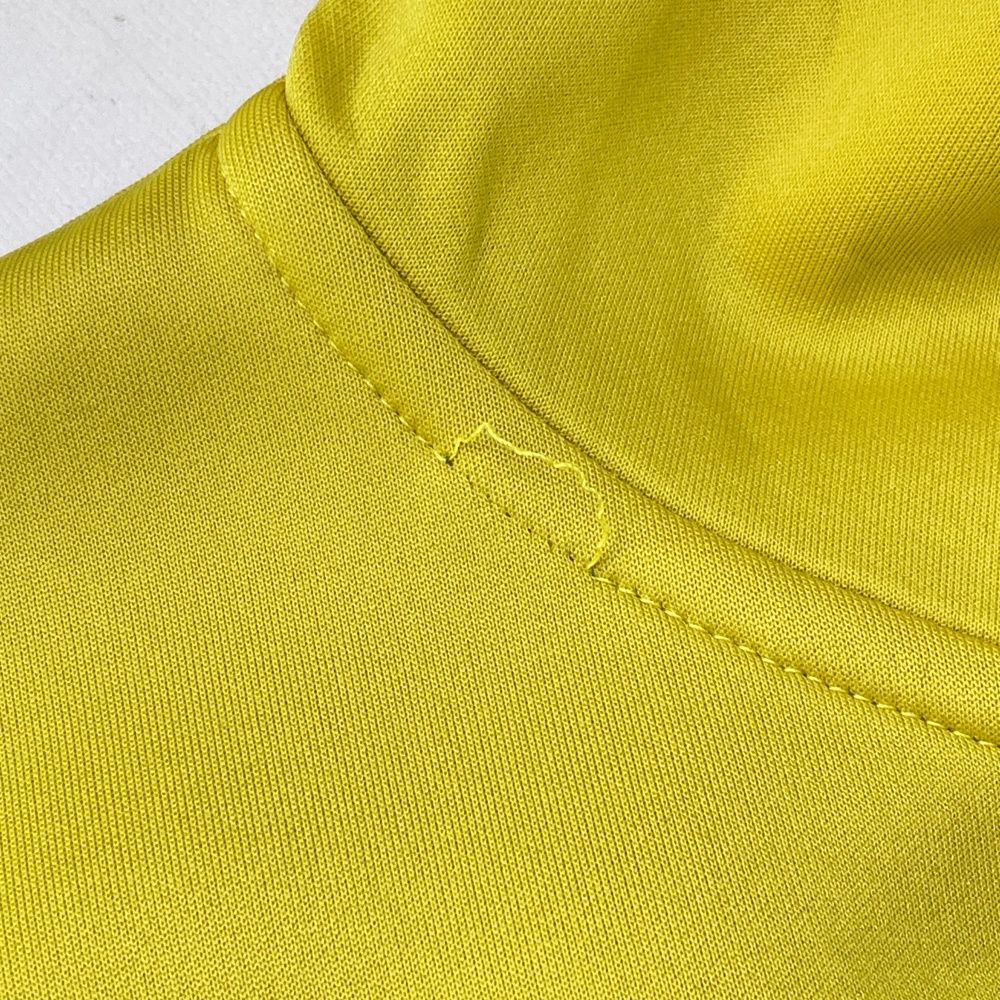 首元ほつれ、フロント汚れ、袖毛羽立ち