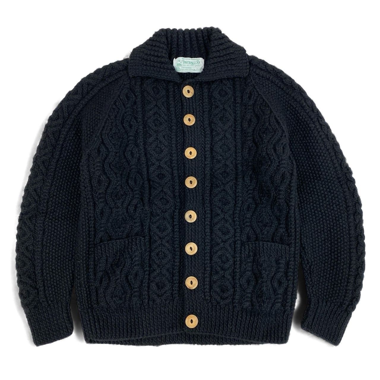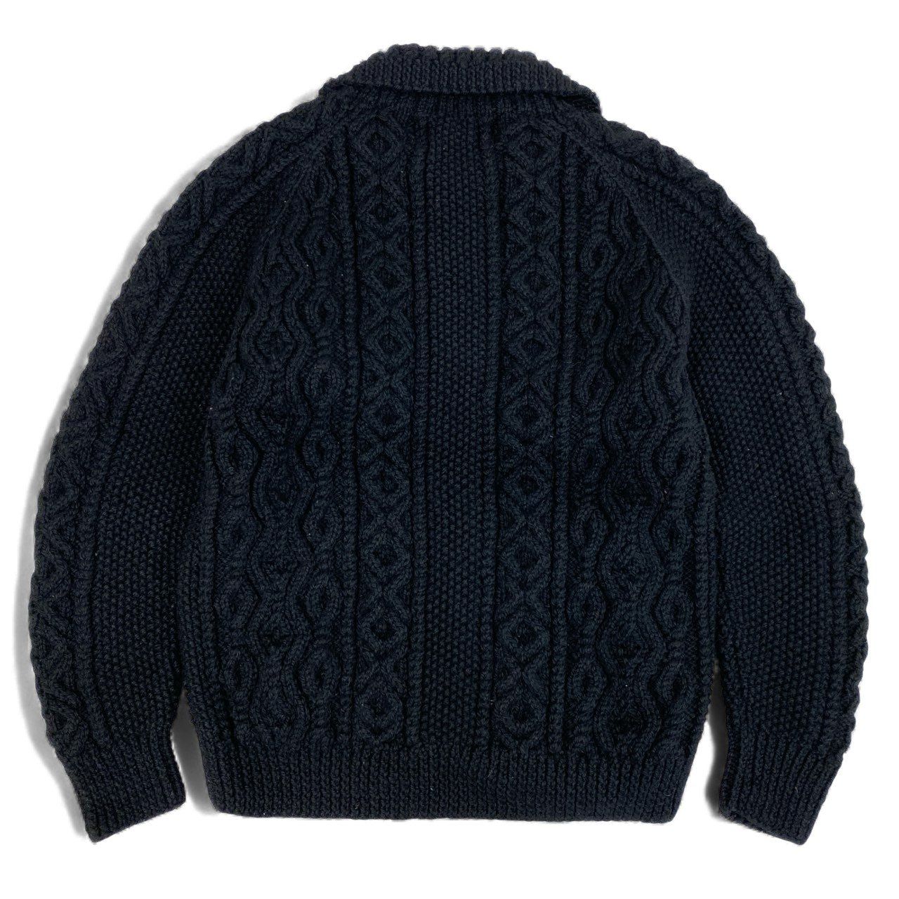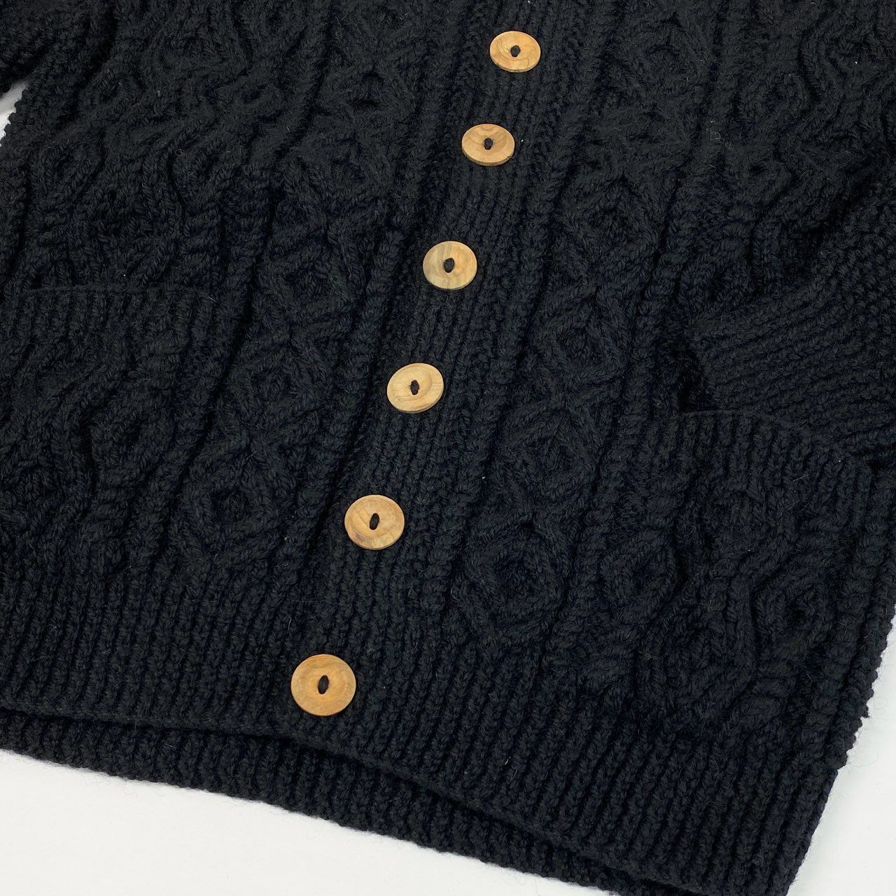 深みのあるブラックに近いミッドナイトネイビーの色味で、重厚なウールの質感が際立つインバーアランのランバーカーディガン。立体的なケーブル編みや、ハンドニットならではの存在感ある編み目がクラフト感と高級感を演出します。温かみのあるウッドボタンがアクセントとなり、アメカジからクラシックなスタイルまで幅広く相性抜群。ジャケット感覚で羽織れる肉厚なニットで、冬場のアウターとしても活躍する一着です。