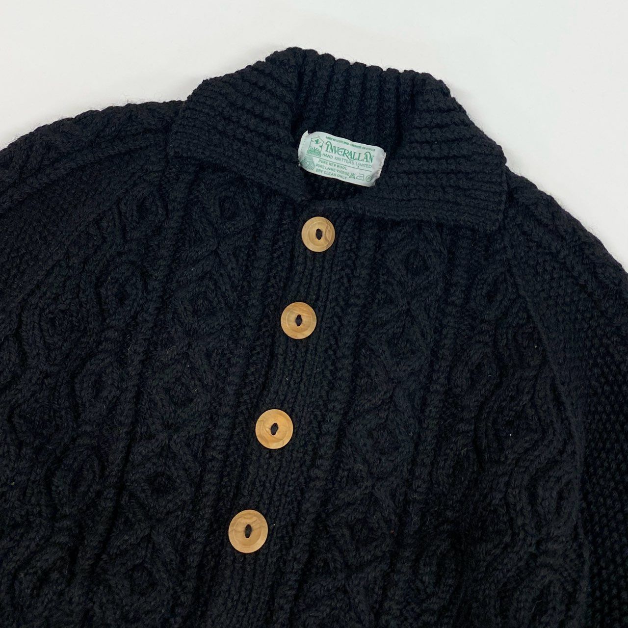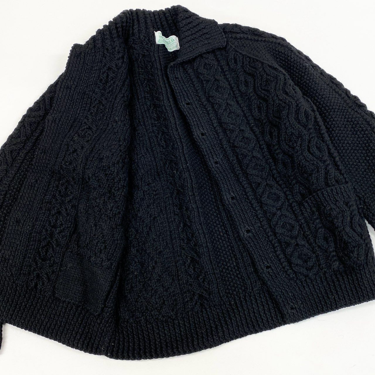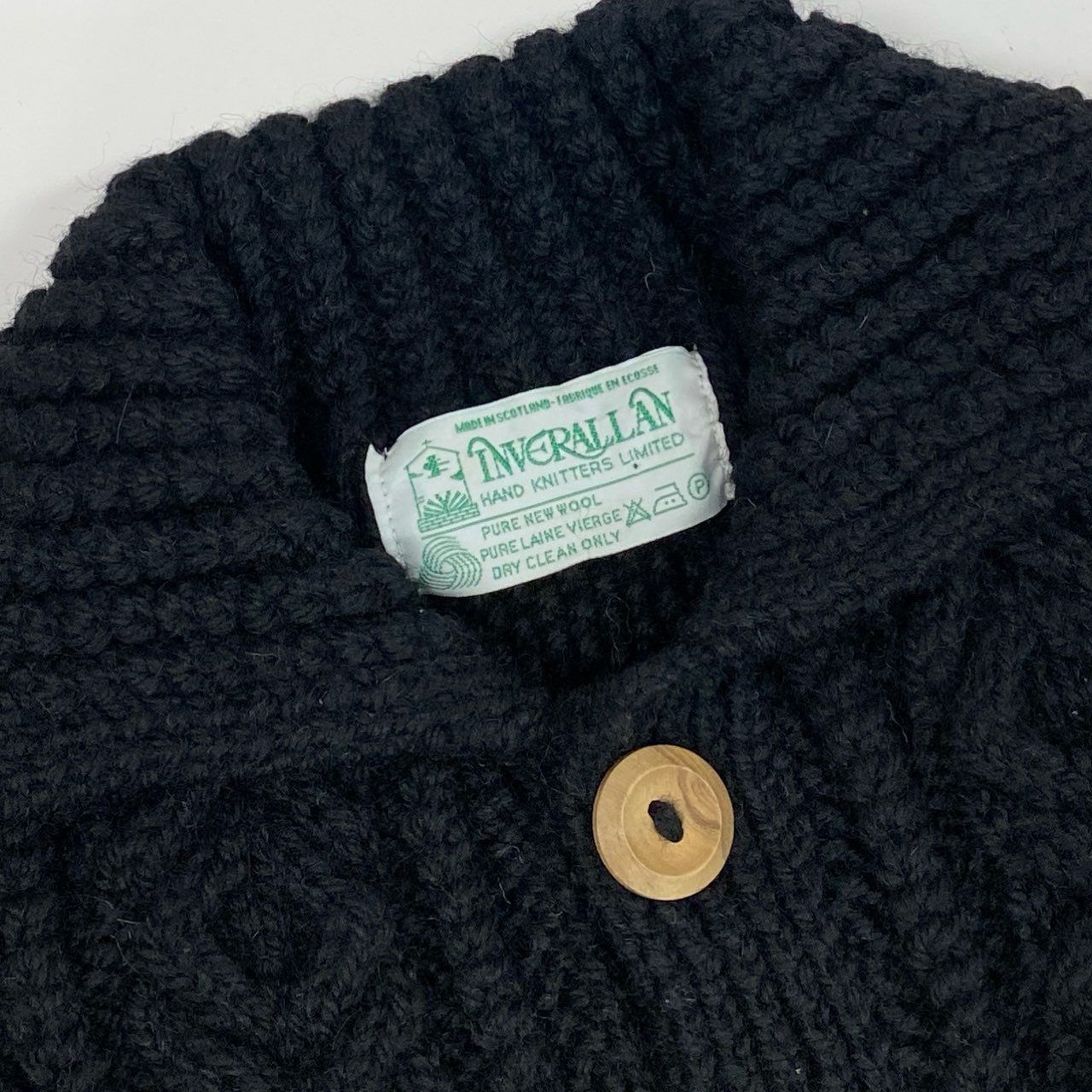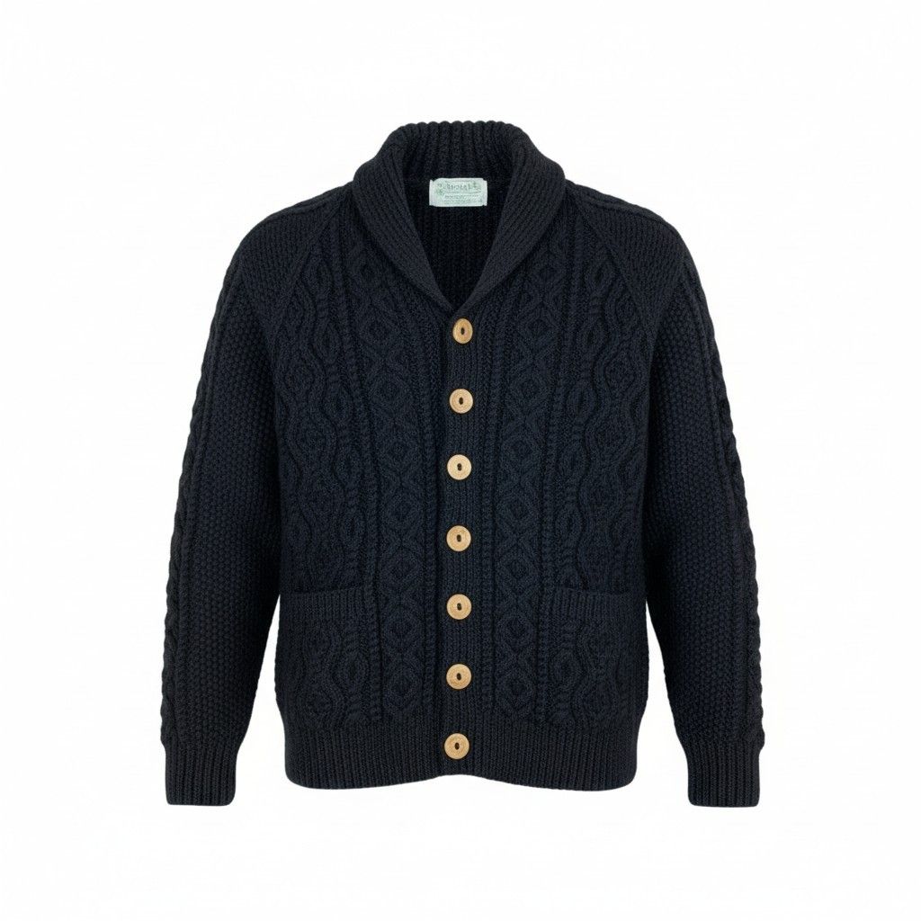 深みのあるブラックに近いミッドナイトネイビーの色味で、重厚なウールの質感が際立つインバーアランのランバーカーディガン。立体的なケーブル編みや、ハンドニットならではの存在感ある編み目がクラフト感と高級感を演出します。温かみのあるウッドボタンがアクセントとなり、アメカジからクラシックなスタイルまで幅広く相性抜群。ジャケット感覚で羽織れる肉厚なニットで、冬場のアウターとしても活躍する一着です。
