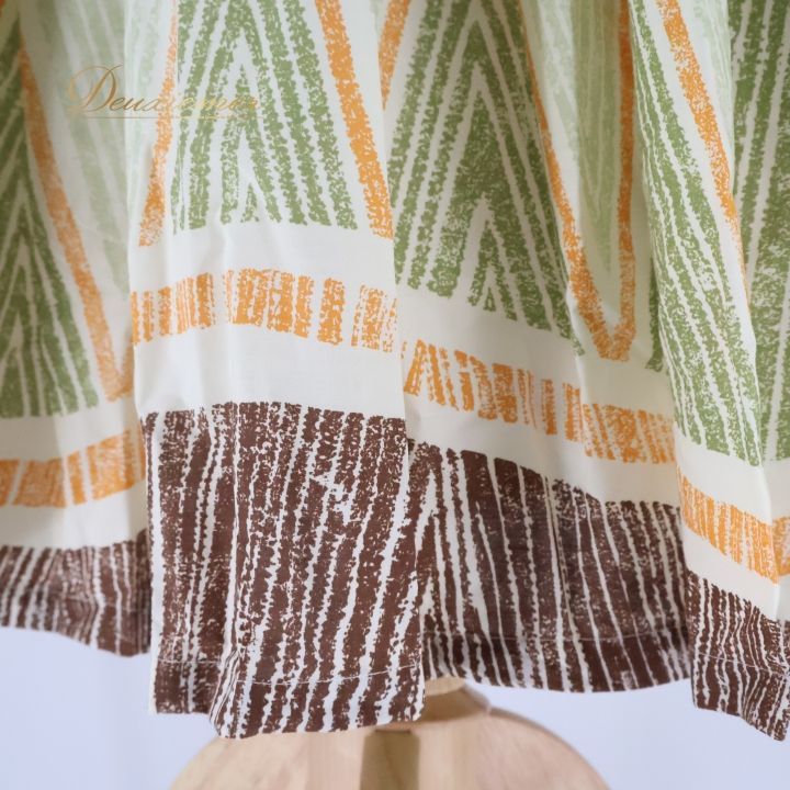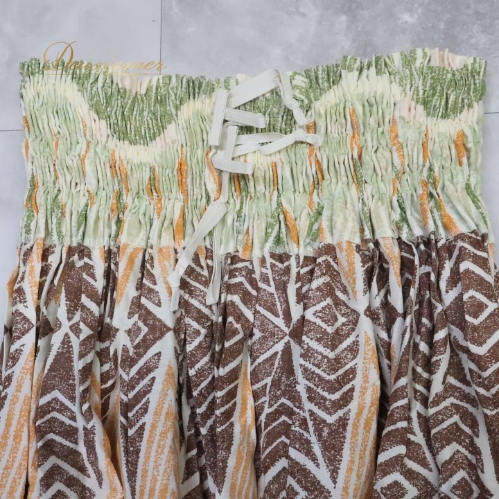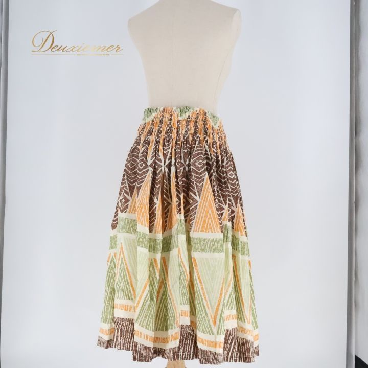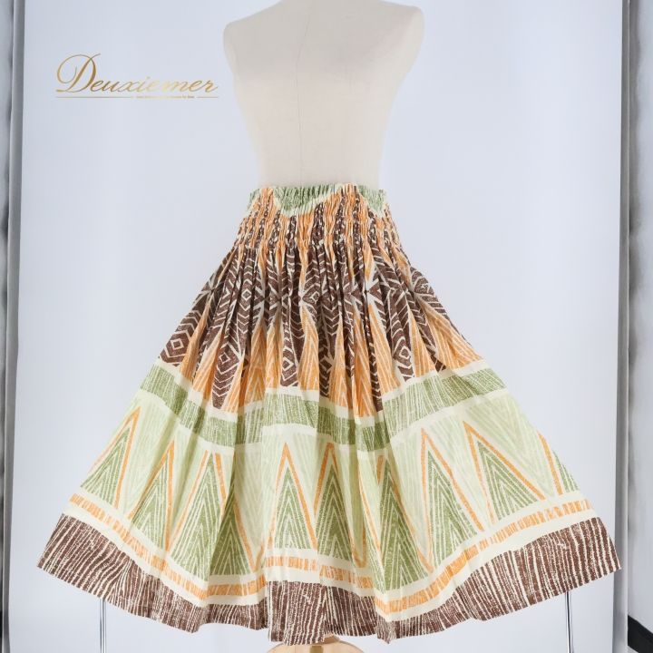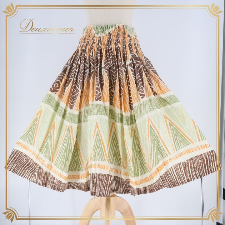 フラダンス 衣装 パウスカート グリーン系 ブラウン系 シングル シンプル カヒコ柄 かわいい 鮮やか 華やか 明るい ふわふわ カラフル ハワイアン アロハ ハワイアンプリント フラ ダンス レッスン 練習 オレンジ系 軽やか カラフルデザイン 柄物