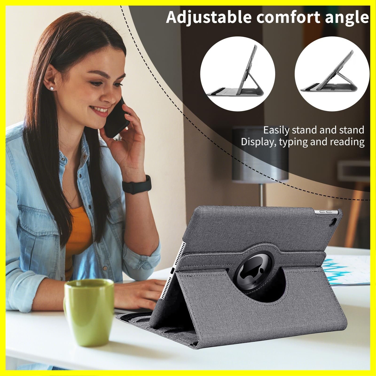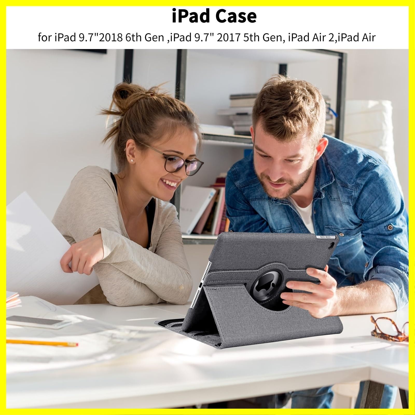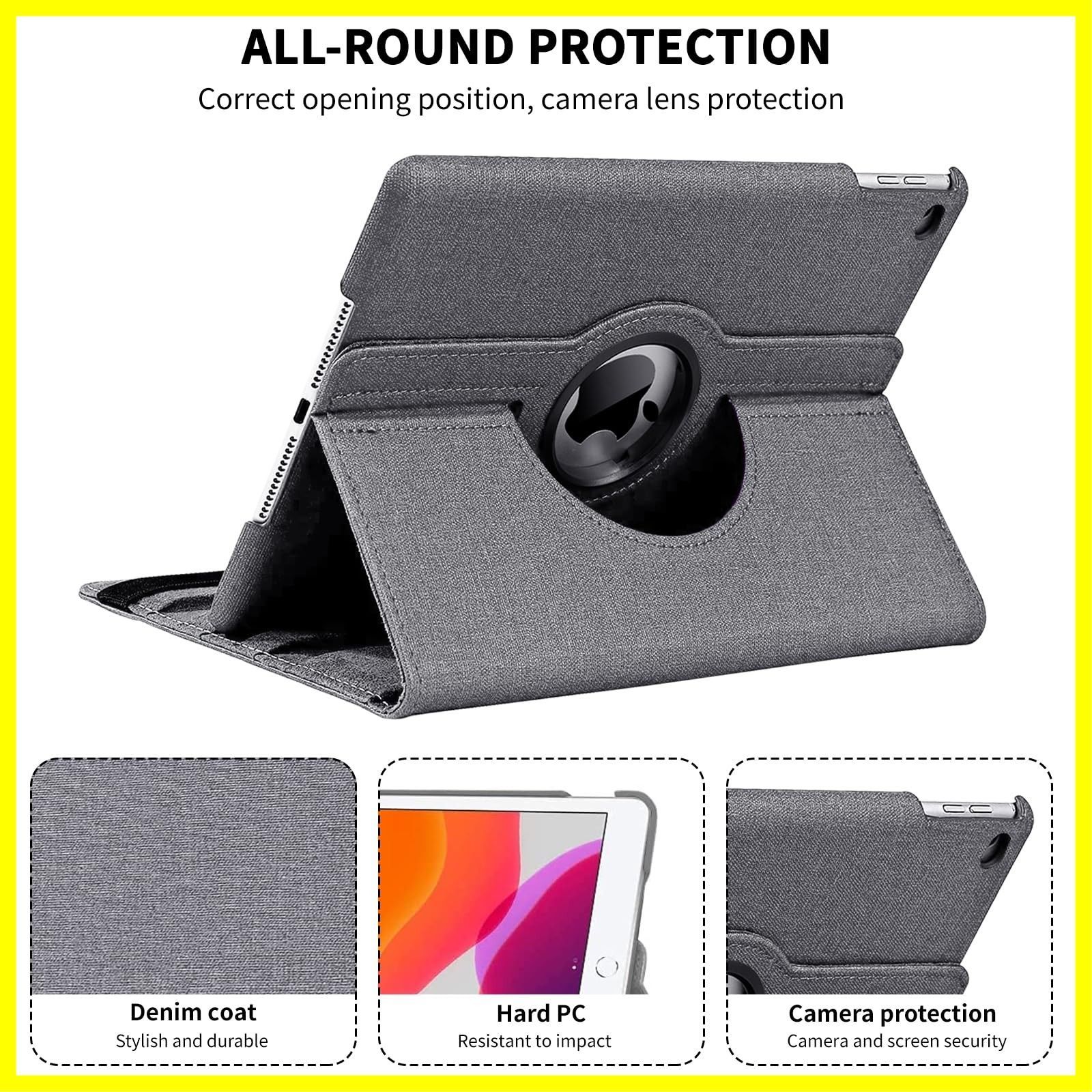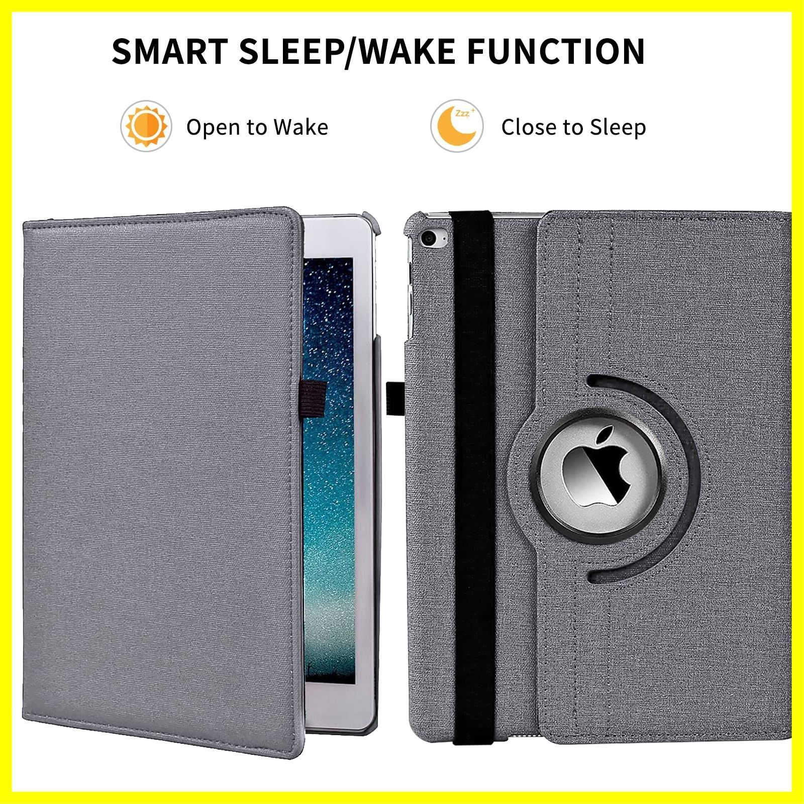 iPad ケース 9.7インチ 2018/2017 (第5世代 第6世代)iPad Air Air 2 カバー 360度回転式 手帳型タブレットケース オートスリープ機能 3段階調節可能 固定バンド 脱落防止 耐衝撃 耐久性 おしゃれデニム生地 (グレー)