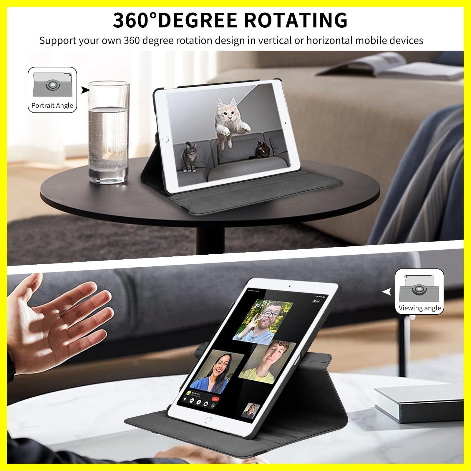【多角度対応】:360度回転設計で向きを変えることで便利なスタンドになります。 フロントカバーの裏側に3つの滑り止め溝が設置されておりますので、縦向きでも横向きでも用途によりお使いいただけます。家での動画鑑賞や電子書籍を見ることなど快適に楽しめます。