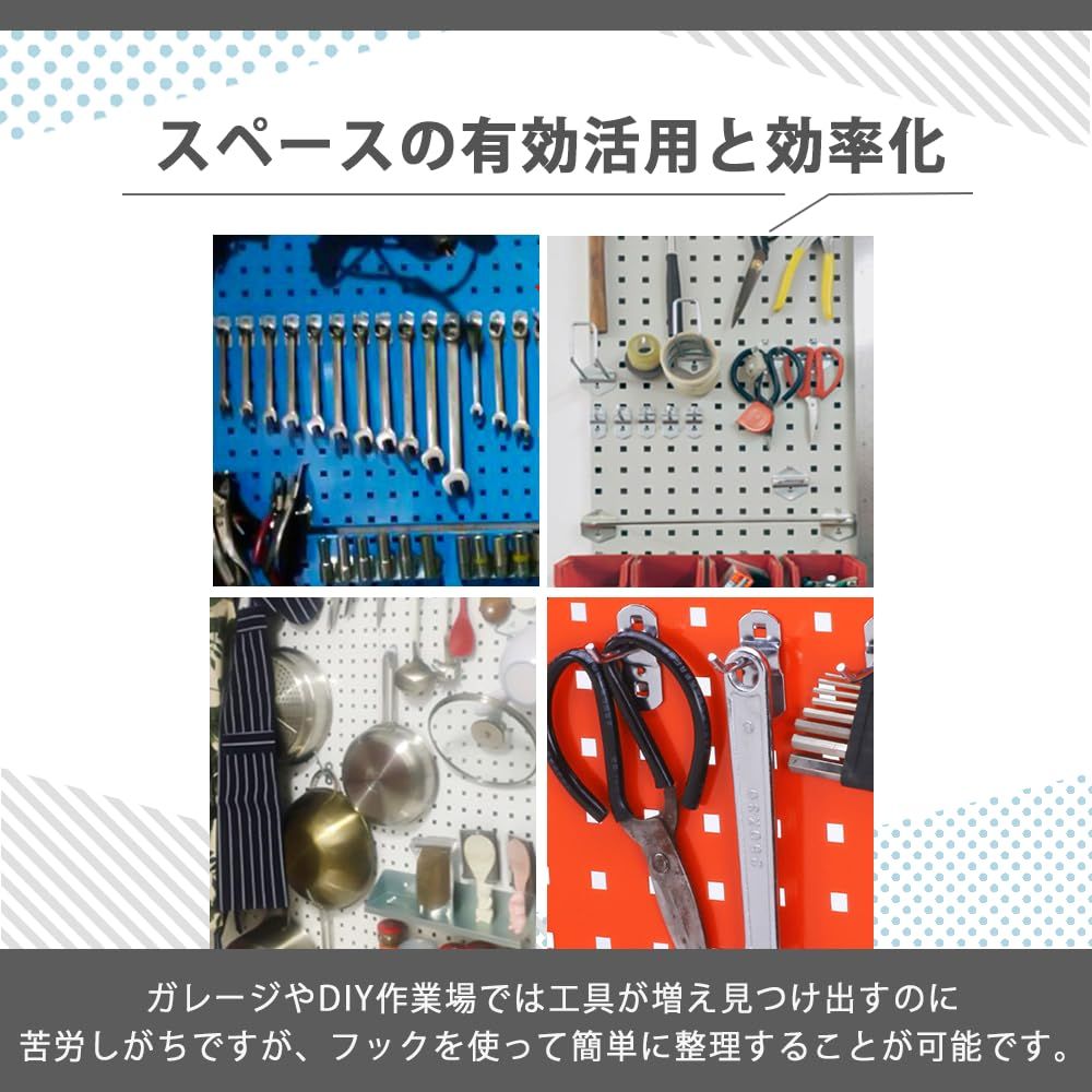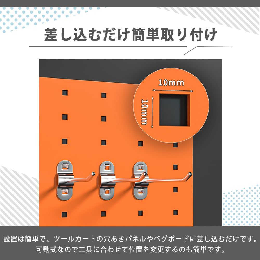 【ツールカート用フック6個】ツールカートにつけることができるフックです。6個セットになっているのでばらつきやすい工具もサッと片付けることができます。【差し込むだけ簡単取り付け】設置は簡単で、ツールカートの穴あきパネルやペグボードに差し込むだけです。可動式なので工具に合わせて位置を変更するのも簡単です。【スペースの有効活用と効率化】ガレージやDIY作業場では工具が増え見つけ出すのに苦労しがちですが、フックを使って簡単に整理することが可能です。作業効率を上げるためにも整理整頓に最適なアイテムです。ツールカートにつけることでスペースを有効活用することもできます。【商品詳細】素材:スチール、サイズ:50奥行き x 25幅 x 60高さ mm【安心の30日保証&オリジナルパッケージ付】AZNABLEブランドより、オリジナルパッケージで迅速にお客様の元へお届けいたします。また本製品は購入から30日間の返品保証付きとなります。商標登録第6473556号 【ツールカート用フック6個】ツールカートにつけることができるフックです。6個セットになっているのでばらつきやすい工具もサッと片付けることができます。 【差し込むだけ簡単取り付け】設置は簡単で、ツールカートの穴あきパネルやペグボードに差し込むだけです。可動式なので工具に合わせて位置を変更するのも簡単です。 【スペースの有効活用と効率化】ガレージやDIY作業場では工具が増え見つけ出すのに苦労しがちですが、フックを使って簡単に整理することが可能です。作業効率を上げるためにも整理整頓に最適なアイテムです。ツールカートにつけることでスペースを有効活用することもできます。