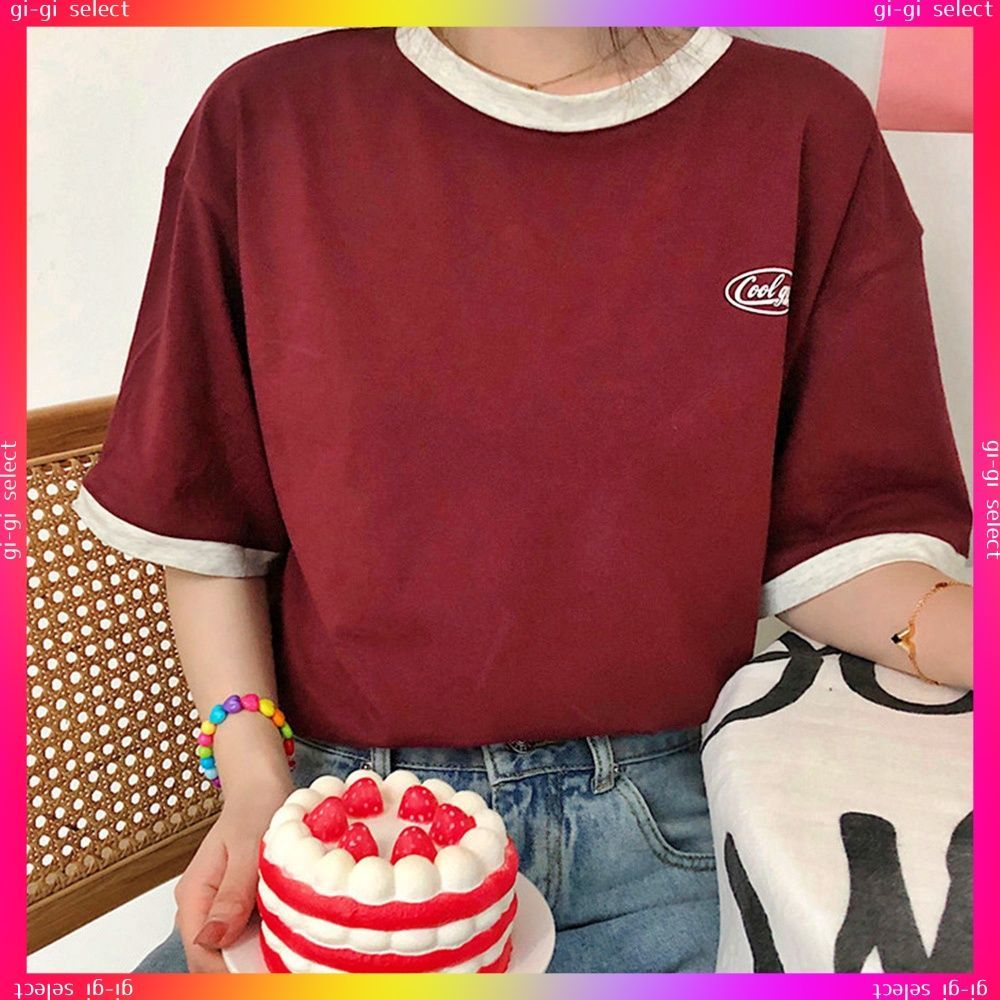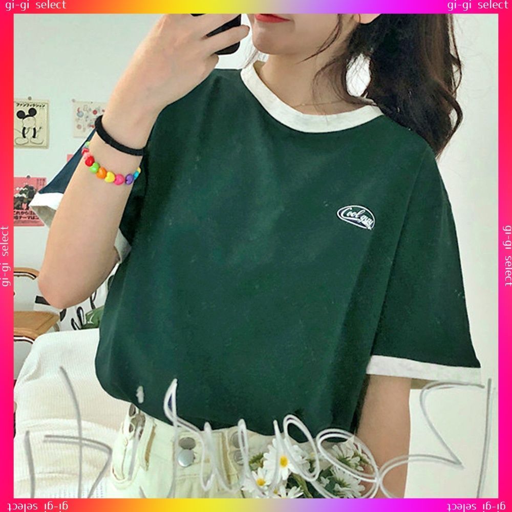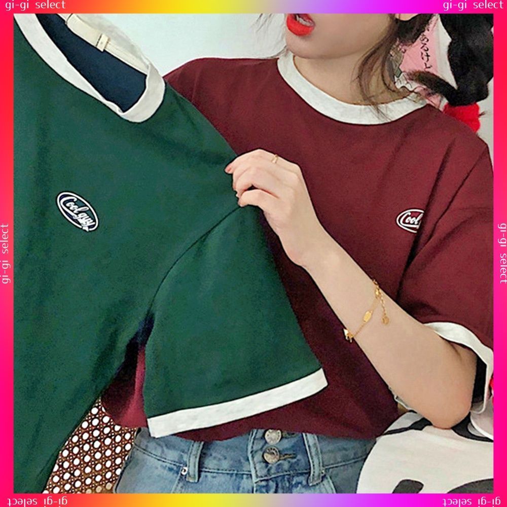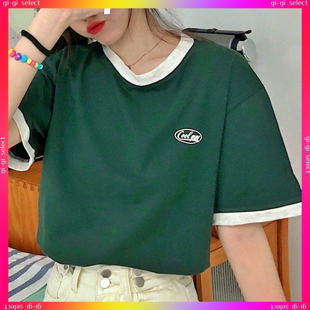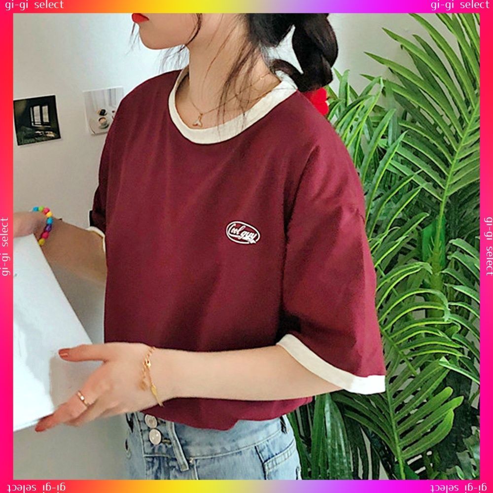 送料無料 バイカラーTシャツ 韓国半袖 カジュアルおしゃれ ロゴ カットソー レディース クルーネック シンプル 夏服 トップス 可愛い プルオーバー スポーティー可愛いシンプル配色ロゴt ラウンドネック夏服 サマーtシャツ無地