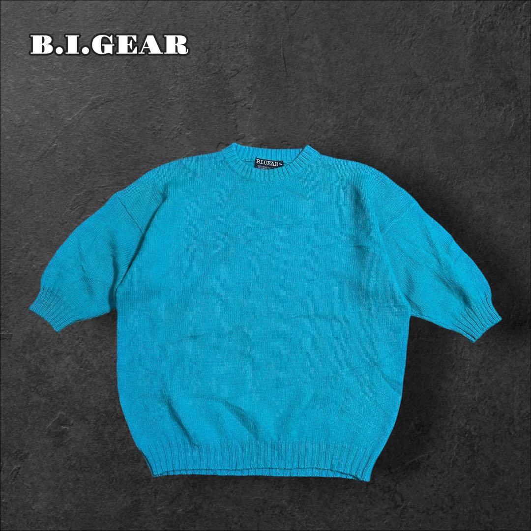 B.I.GEAR半袖ニットセーターwoolウールターコイズブルー古着クルーネック