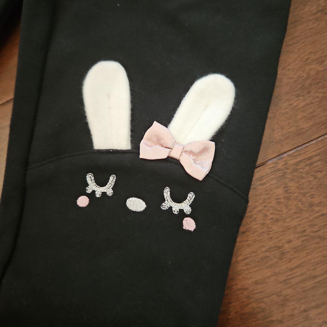 ウサギの耳とリボンの刺繍が施された黒のフリースパンツ、100cmサイズ。 ニットプランナー、KP 1度試着で着用したのみです。 - 色: 黒 - デザイン: ウサギの耳とリボンの刺繍 - 素材: フリース - サイズ: 100cm ご覧いただきありがとうございます。