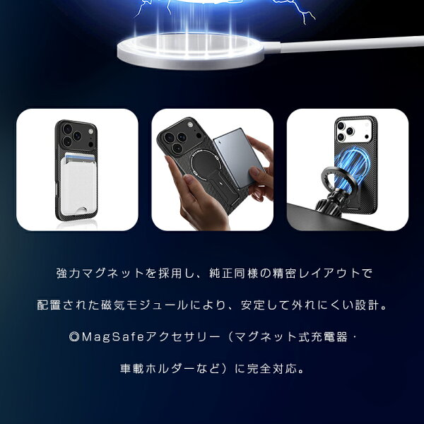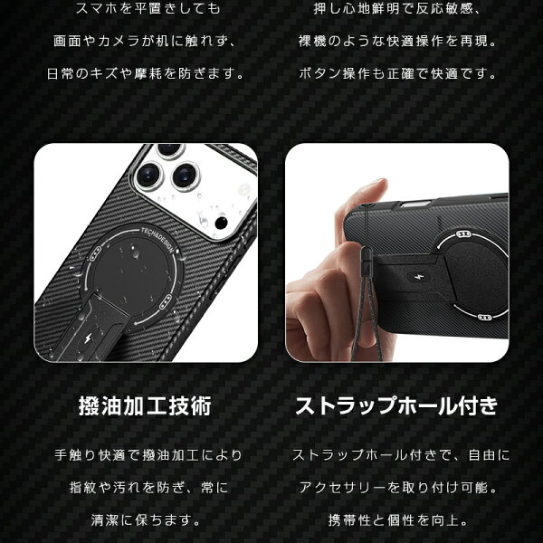 本製品は、iPhone専用に設計された、高品質で多機能な保護ケースです。軍事規格の耐衝撃性、カーボンファイバー素材と折りたたみスタンド、強力なマグネット機能をはじめ、細部までこだわった設計で、お使いのiPhoneをしっかりと保護するとともに、利便性とスタイリッシュなデザインを兼ね備えています。