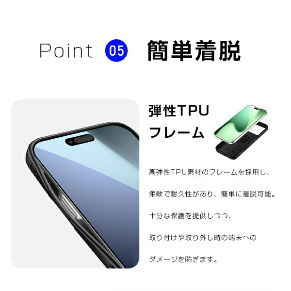 フレーム部分には高弾性のTPU素材を採用。非常に柔軟で耐久性に優れています。取り付けと取り外しが簡単で、その過程でiPhoneに傷つけることなく、確実な保護を提供します。