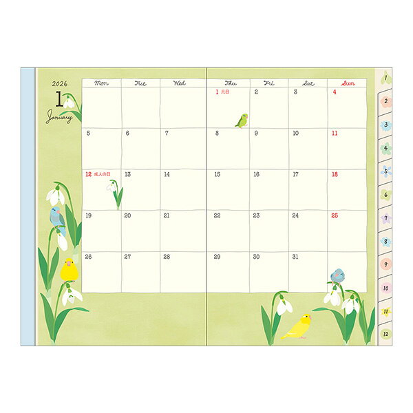 お花畑の中でトリさんたちがおしゃべりしていたり、さまざまな植物が並ぶ中で楽しそうに遊んでいるシーンは、鳥ならではの魅力がいっぱい。 2026年版も色とりどりのトリさんたちと植物を組み合わせたデザインで、毎日に彩りと癒しを届けます。