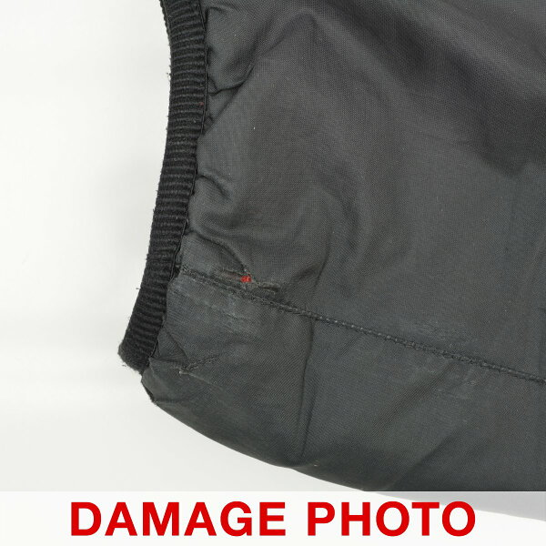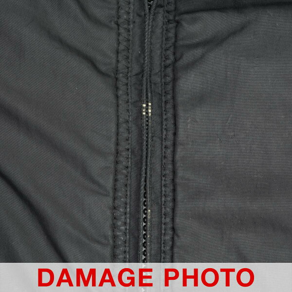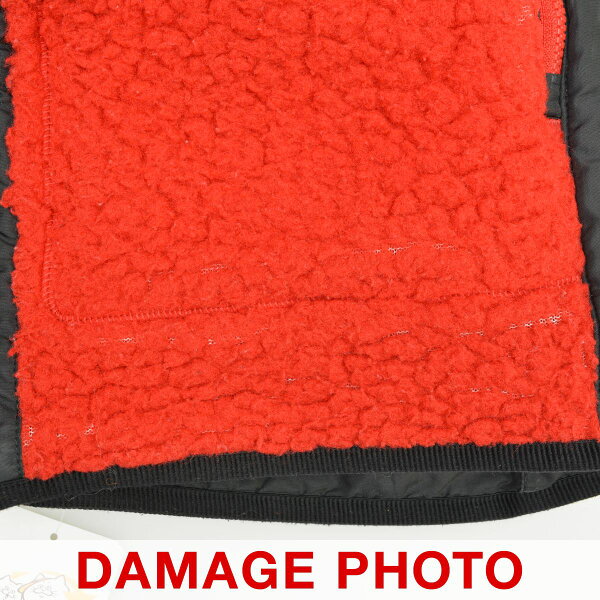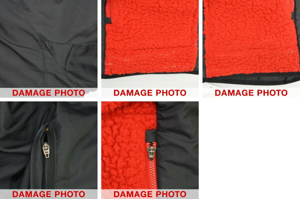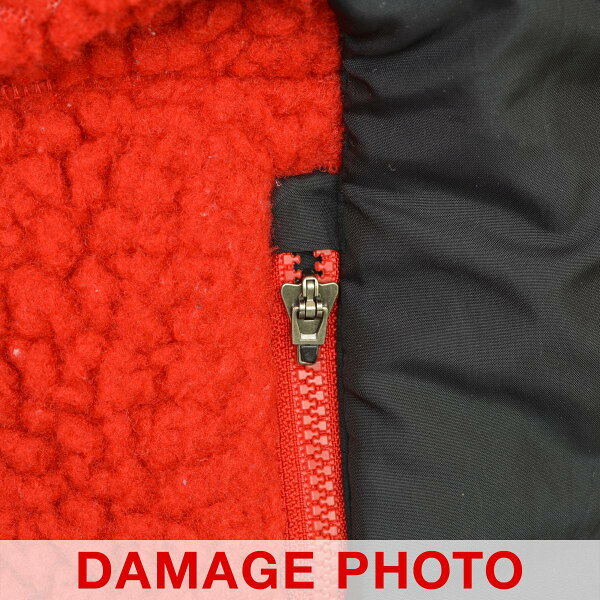 USED品となりますので、使用感があり、ブラック面全体的に擦れ汚れ、上部ポケットジップの持ち手一部欠損、両袖に破れ、レッド面毛羽立ち・ボア潰れ・ボア抜け、ジッパーの補助フィルムに剥がれが見られます。