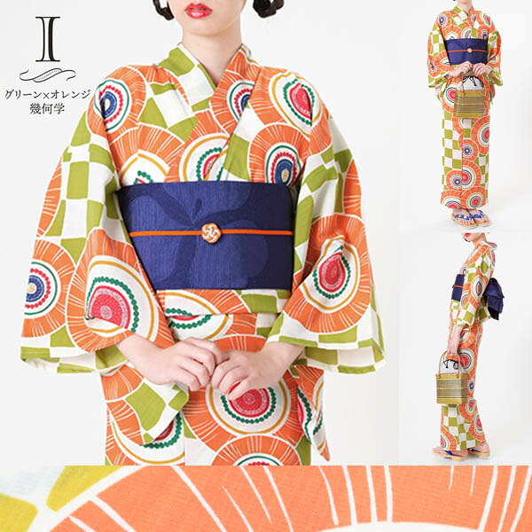 I.グリーン×オレンジ 幾何学浴衣…ごく薄いアイボリー地に明るいグリーンを配した、ちょっとポップな市松模様。その上に、円と線を組み合わせた、花や傘のように見える、不思議な幾何学模様が重なっています。模様部分は明るいオレンジ色や濃い緑色、赤や濃い青色が使ってあり、とってもカラフル!