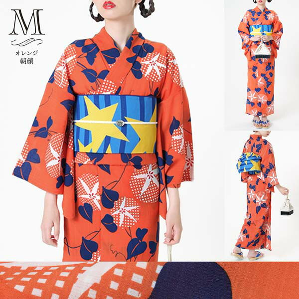 M.オレンジ 朝顔浴衣…濃く明るいオレンジ色地に、朝顔の花と葉と蔓模様がシンプルで可愛らしい。葉とツルは紺色で、朝顔の花部分は、オレンジ色と白色のレトロな格子模様。花の中心部分は濃い赤色。