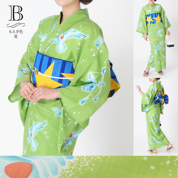 B.もえぎ色 星浴衣…もえぎ色地全体に配された、水色系の淡い色使いがロマンティックな星座モチーフ。爽やかかつ華やかな色合いの効果で、明るくオシャレな印象をアピールできる一枚です。