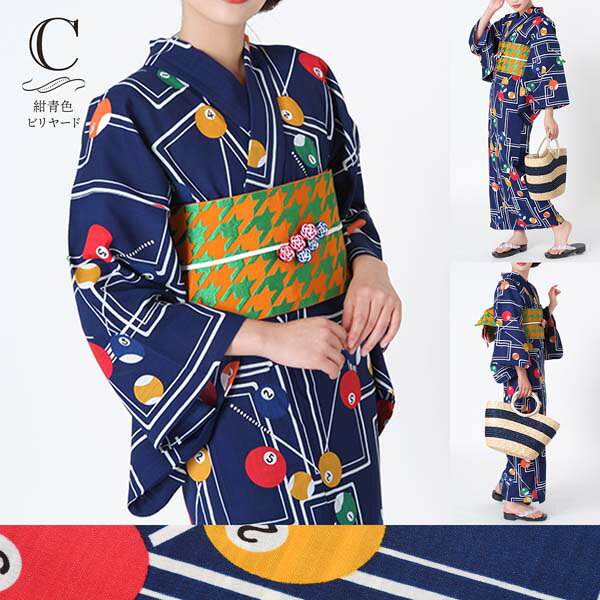 C.紺青色 ビリヤード浴衣…濃い紺青色地に、ビリヤード台を思わせる、白色のスクエア模様。鮮やかで濃い赤・黄・緑・オレンジ色などカラフルなビリヤードの玉と、モノトーンのキュー。どこかレトロな印象を漂わせるオシャレ柄!