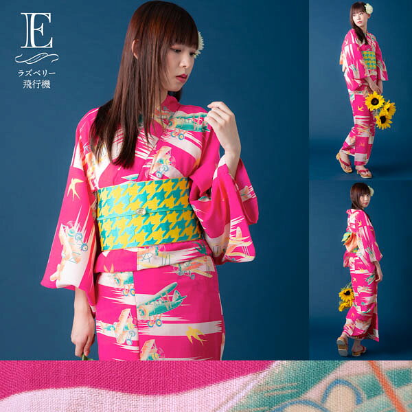 E.ラズベリー 飛行機浴衣…ビビッドなラズベリー色地に、白色のシャープなギザギザ横ライン。その上に、レモンイエローとターコイズグリーン、アプリコットオレンジ色のレトロな飛行機と、颯爽と舞うツバメ柄。スタイリッシュなモダンガールの印象。