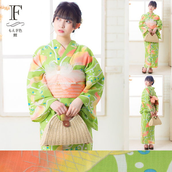 F.もえぎ色 鯉浴衣…澄んだもえぎ色地に、縦に連なる白色の流水線。流水線のところどころには、水しぶきを思わせるような深い水色。その上を、いきいき元気よく鯉が泳いでいる様子が涼しげ。ダイナミックな絵柄に、イエローとオレンジのふんわりした色使いの鯉の様子が賑やかです。