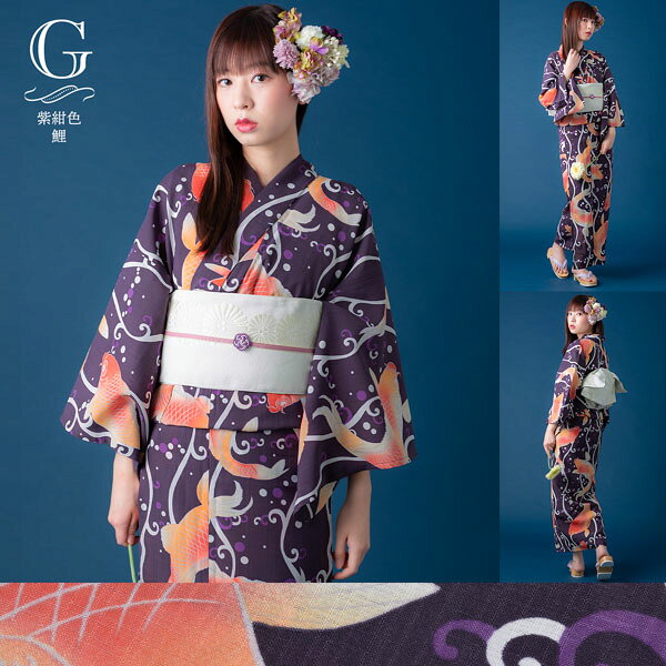 G.紫紺色 鯉浴衣…暗い紫紺色地に、縦に連なる白色の流水線。流水線のところどころの紫色がポイントに。その上を、鯉が優雅にいきいきと泳いでいる様子が涼しげ。ダイナミックな絵柄に、薄い杏色と朱赤に色づいた鯉の様子が賑やかです。