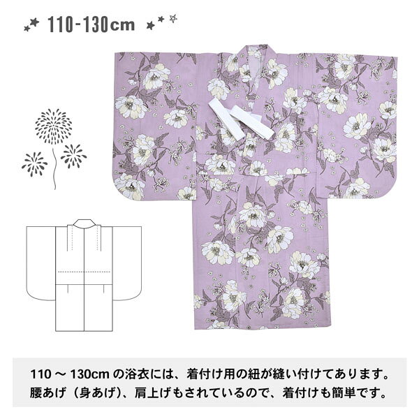 110cm、120cm、130cmの浴衣には着付け用に紐が縫い付けられていて、身あげ、肩上げがされています。140cm、150cmは大人と同じように着付けていただく仕様です。