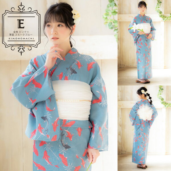 浴衣:落ち着いたグレイッシュな水色の地に、淡いグレーの水草、明るいピンクと薄墨色の金魚の柄。金魚の体の濃淡のぼかしがアクセントとなっています。曲線を描く水草の間を、和金のようなすっきりとしたシルエットの金魚が泳ぐ、金魚鉢を上から見ているかのようなデザインです。スモーキーな地の色と浮き立つような明るいピンクの他にはない色遣いが魅力です。
