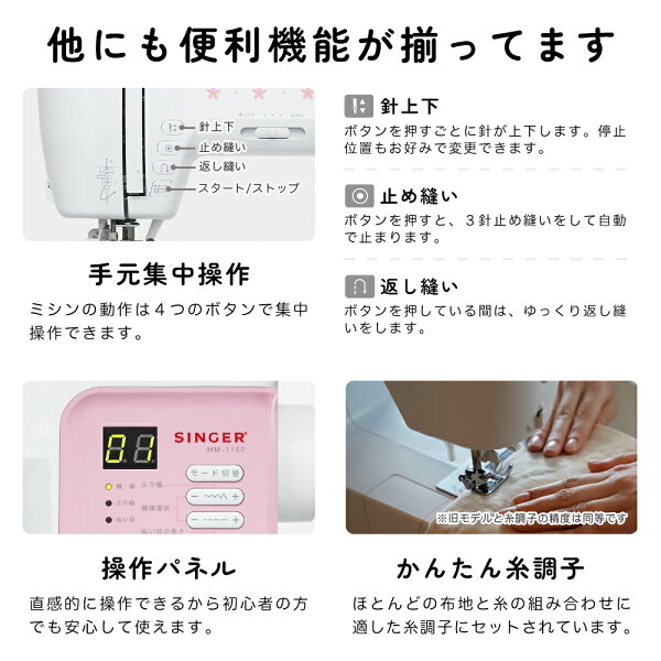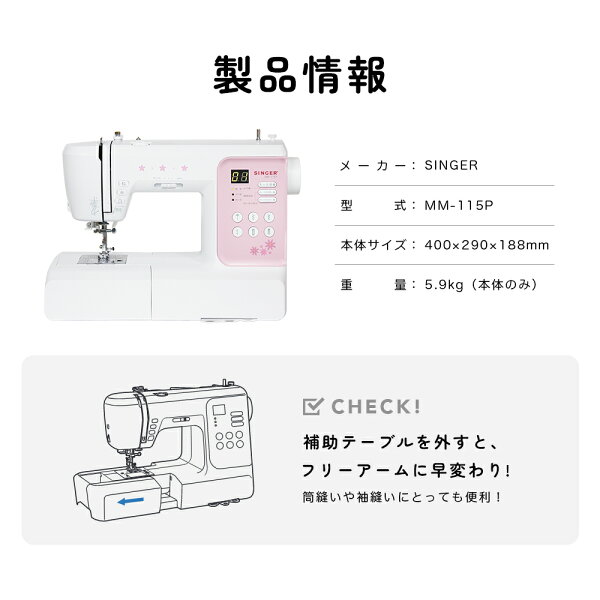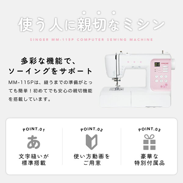 【P10倍!~1/6までの限定企画!】高評価★4.51 文字縫い可能 SINGER シンガー コンピューターミシン MM-115P 初心者 おすすめ シンプル かんたん 軽量 入園入学 子育て 人気 プレゼント ギフト マスク ミシン本体 家電 みしん あす楽