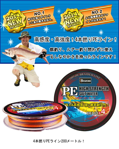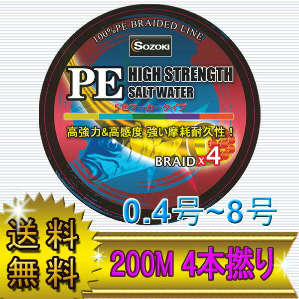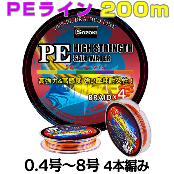 【ネコポス送料無料】PEライン 200m【0.4~8号】4編/4本組 5色マーカータイプ 0.4号/0.6号/0.8号/1号/1.5号/2号/2.5号/3号/3.5号/4号/5号/6号/7号/8号 釣り糸 船釣り 磯釣り 海釣り 投げ釣り ルアー釣り エギング ジギング スロージギング ルアー・ジギング・スロージギング
