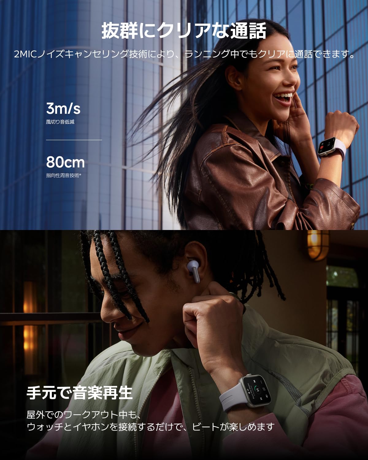 | 設定: | 2.1インチAMOLEDディスプレイ、Bluetooth通話、24日間の自律性、5気圧防水、心拍数とSpO2モニタリング、統合GNSSシステム。 |