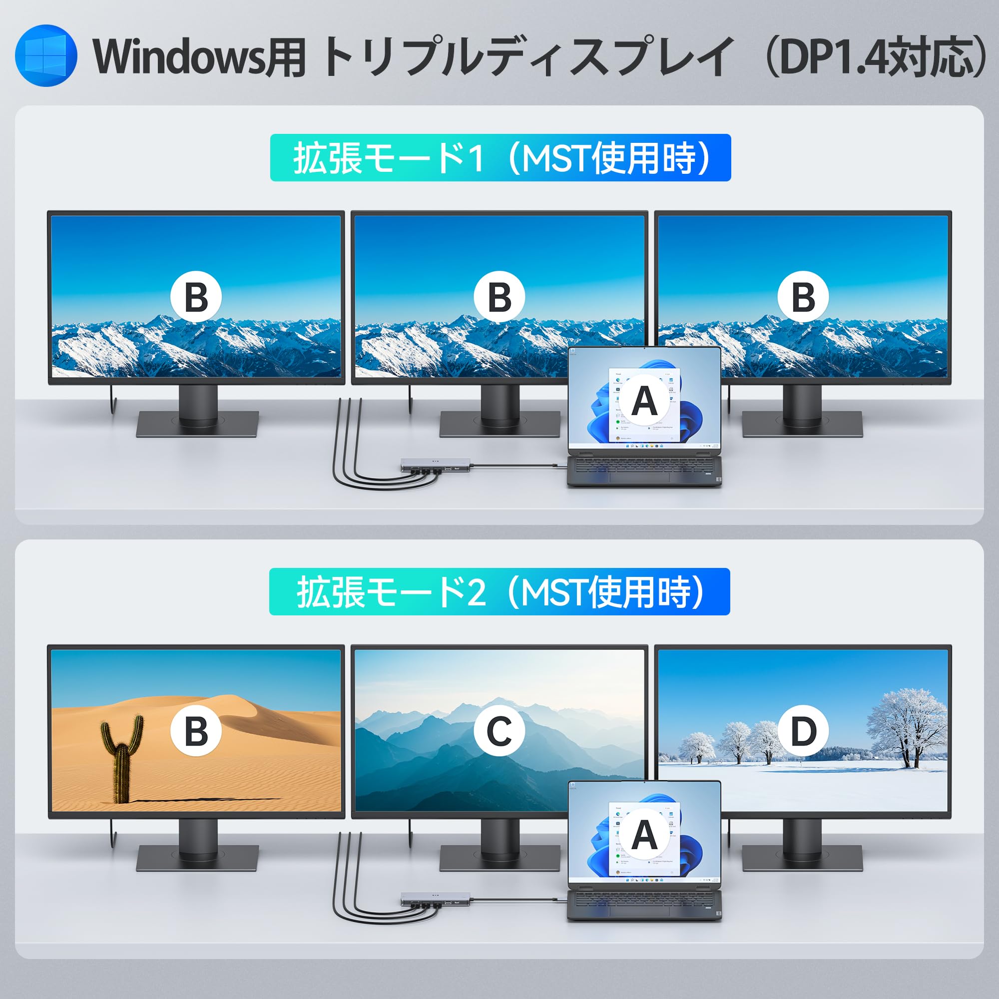 | 商品の追加説明1: | HDMI 4K/60Hz×2、DisplayPort 8K/30Hz、VGA 1080p/60Hzの4画面同時出力を実現, きれいな映像や音声でWEB会議をするためのWEBカメラやヘッドセット, マルチディスプレイにするための外部ディスプレイ, 容量不足を解決するための外付けHDDやSSD, 操作効率を上げるためのキーボードやマウス |