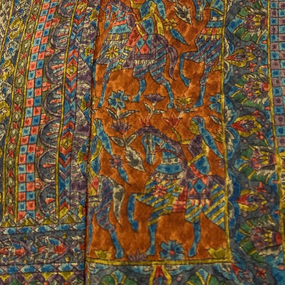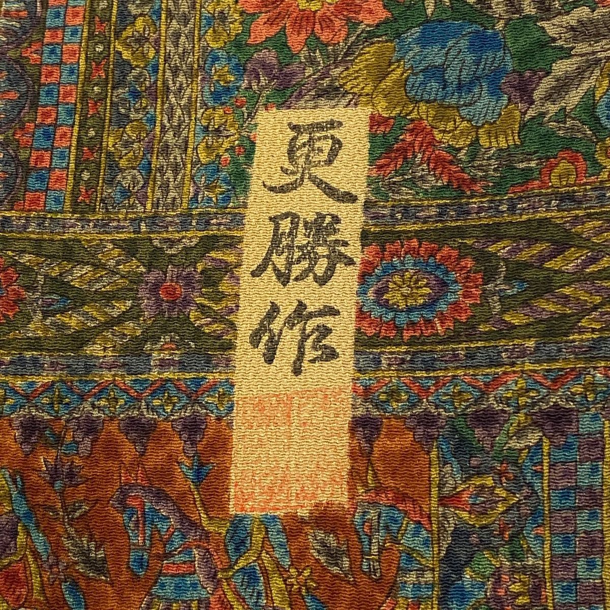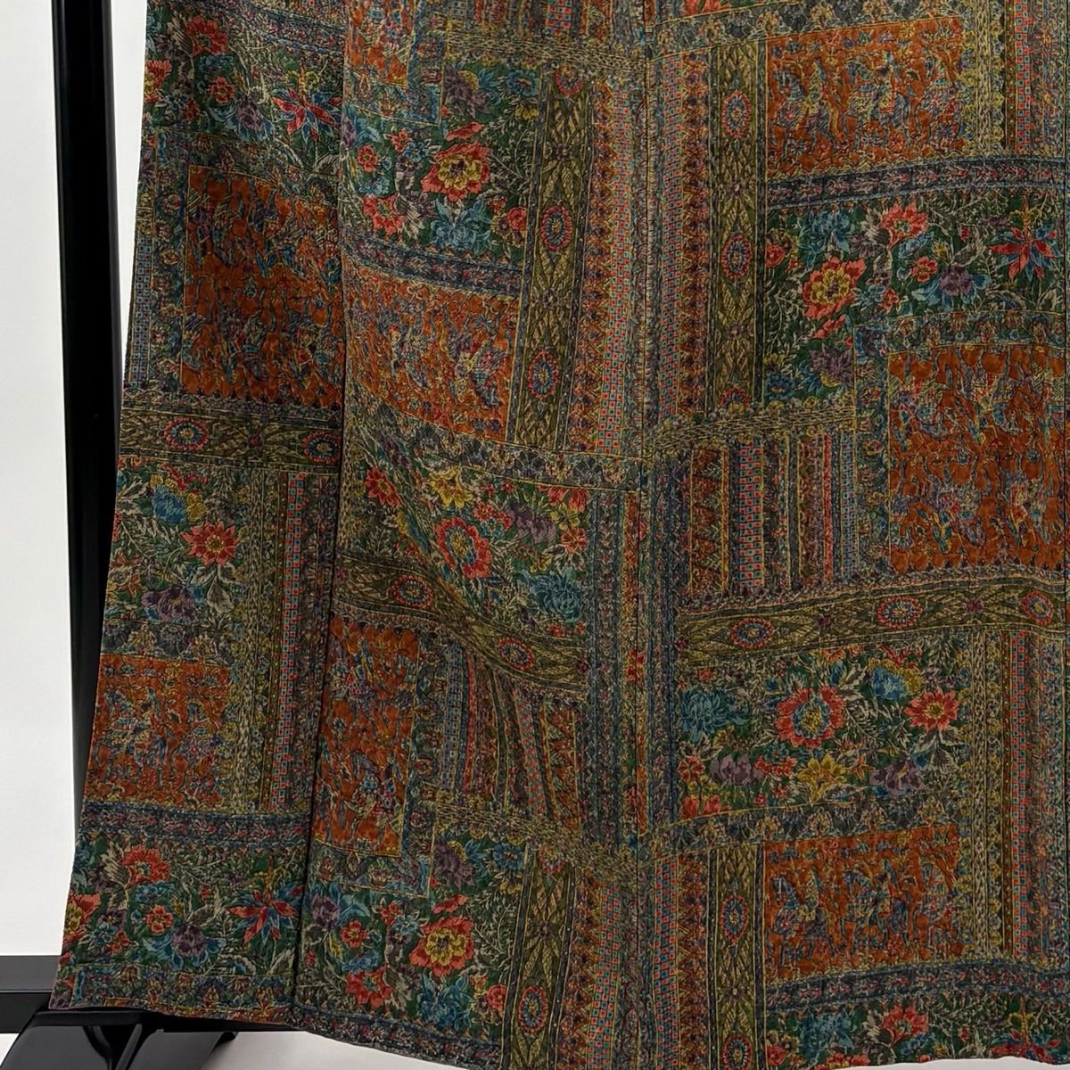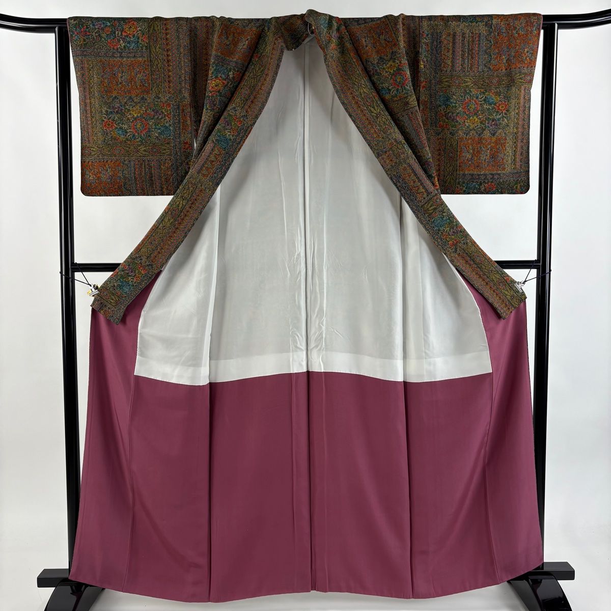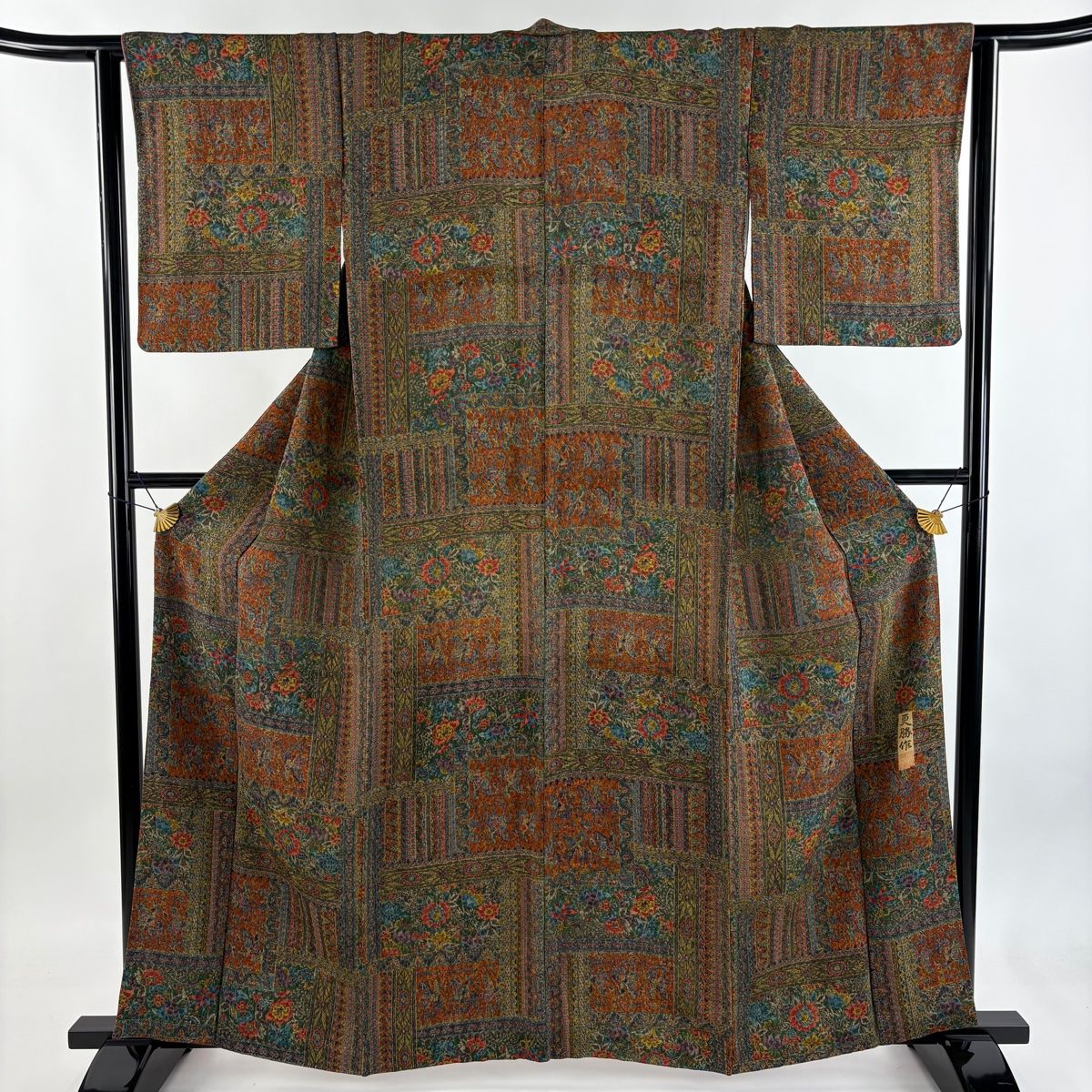 【美品】 小紋 身丈160.5cm 裄丈62.5cm S 袷 更勝 落款 更紗 人物 茶緑色 正絹 秀品 【中古】