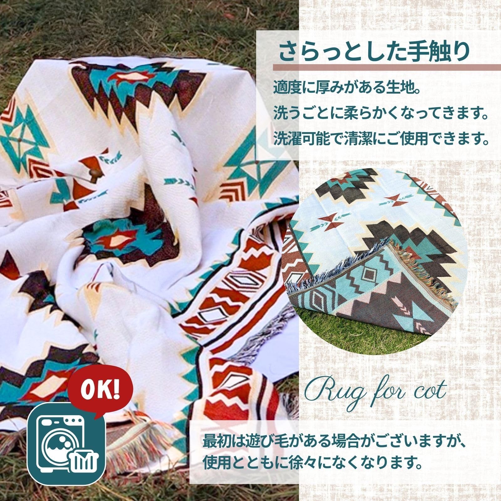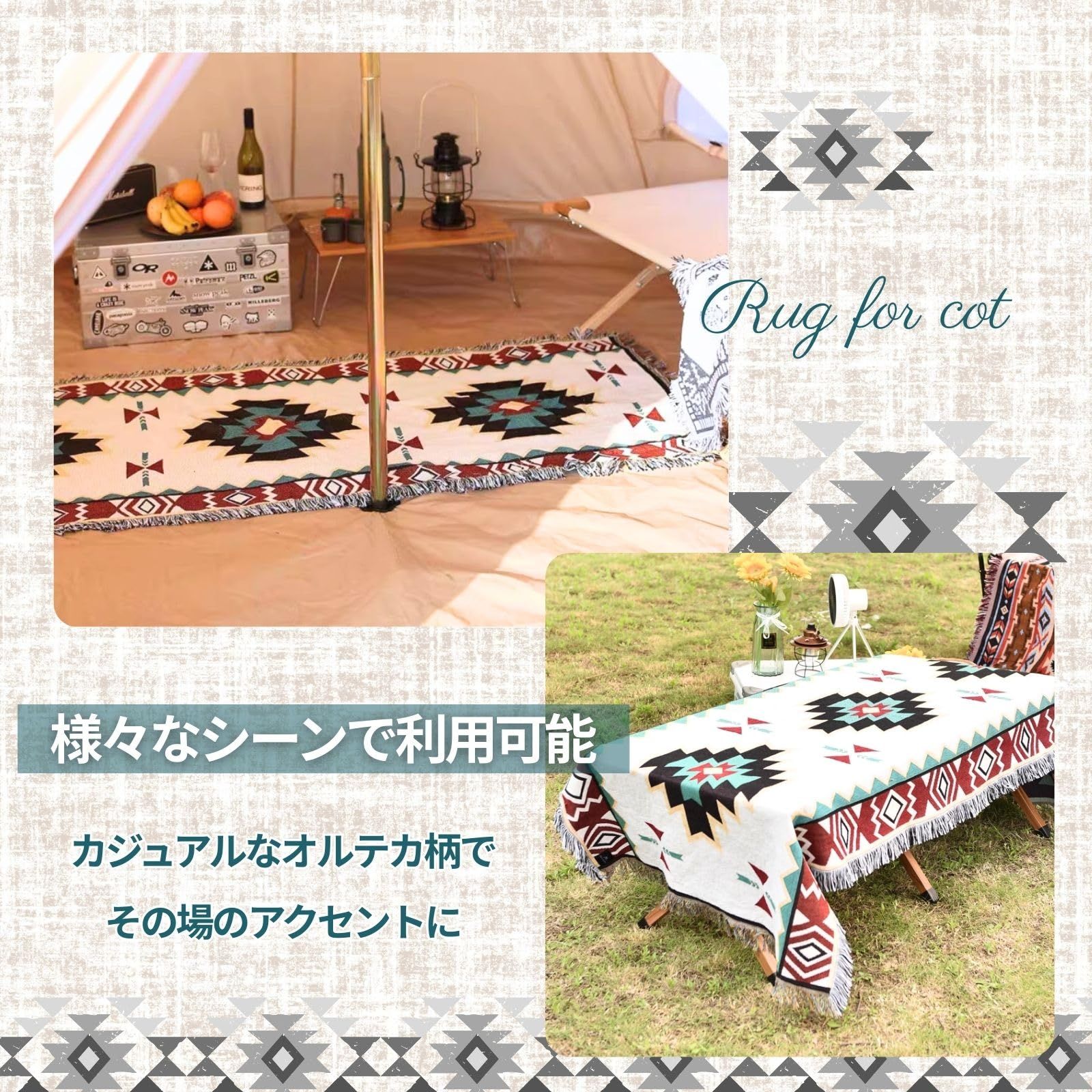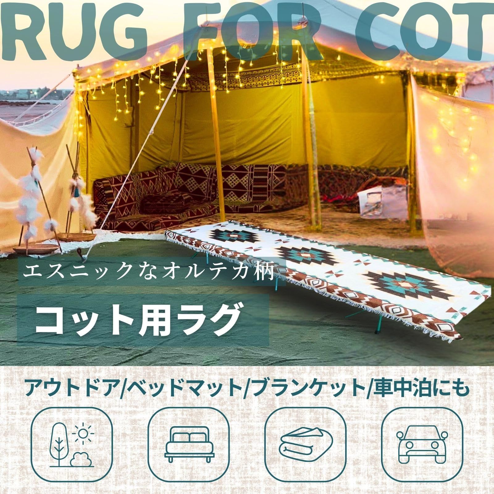 コット用ラグ キャンプ ラグマット オルテカ柄 キリム アウトドア 民族柄 マルチカバー リバーシブル ブランケット (グリーンオルテガ柄 90cm×150cm)