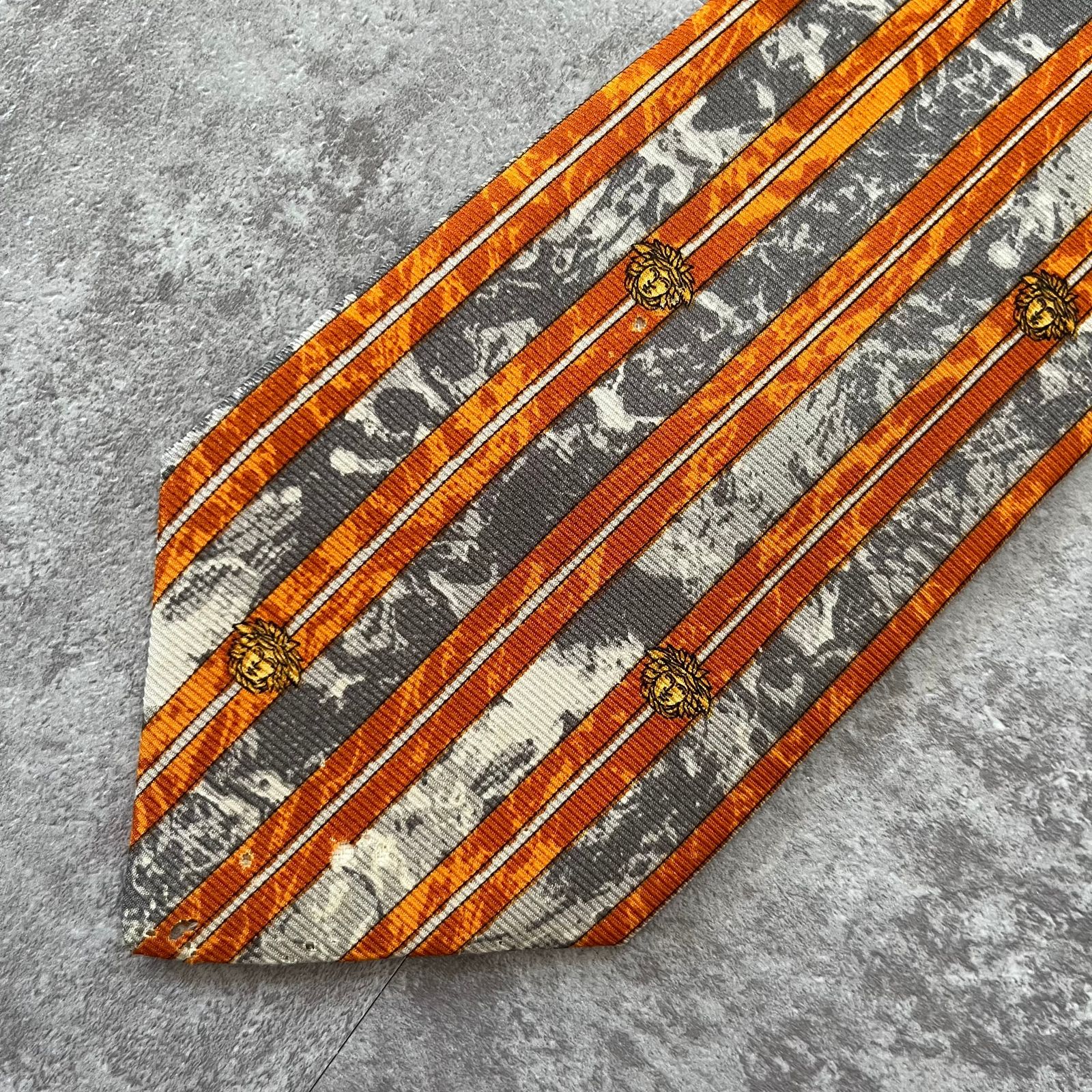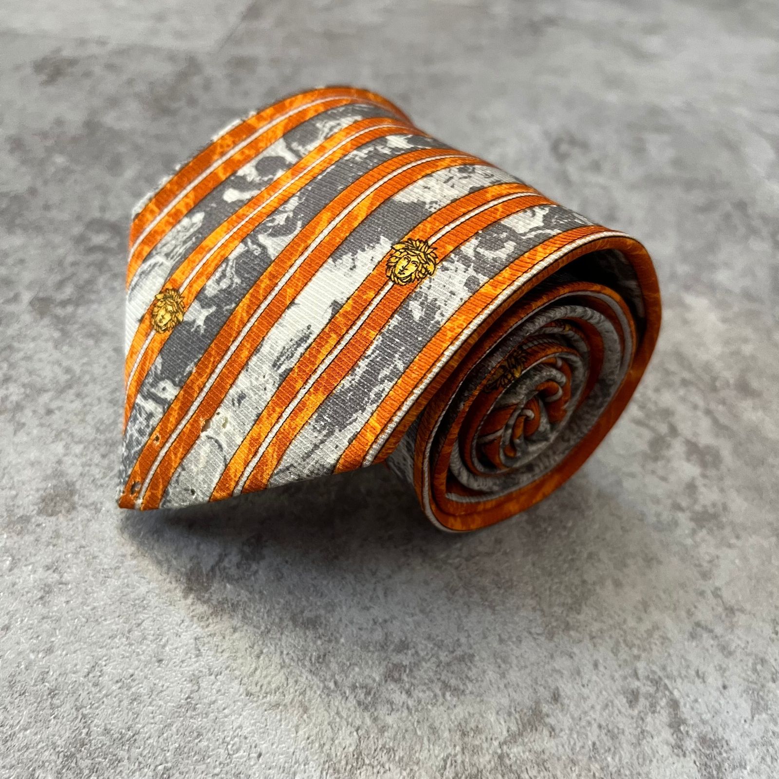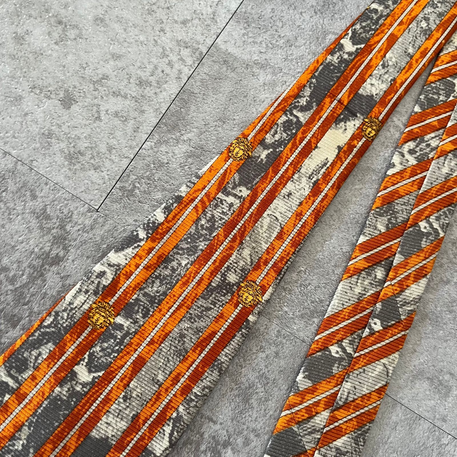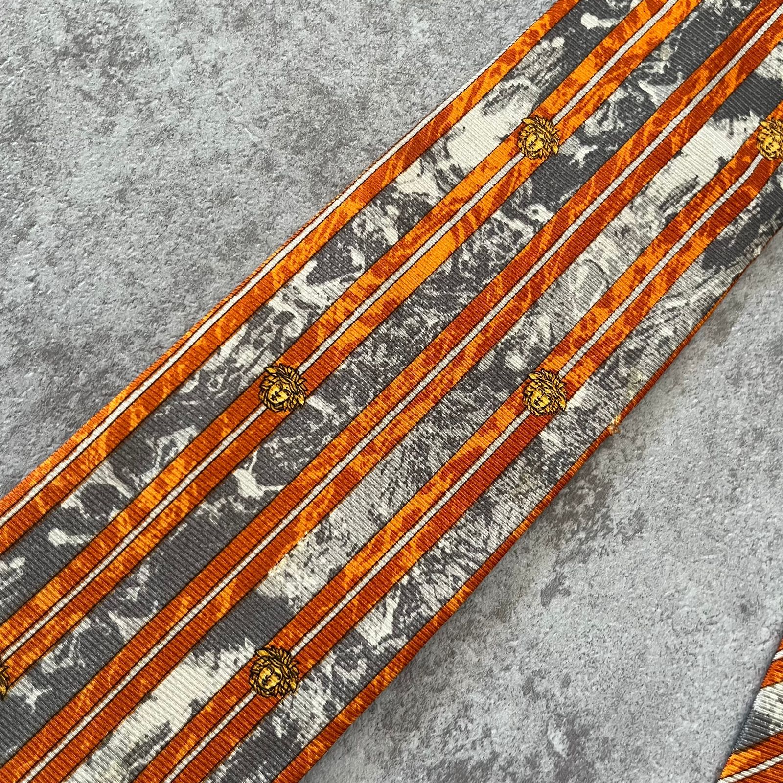 【Versace】バイカラーストライプネクタイ グレー×オレンジ ロゴ入り メデューサロゴ