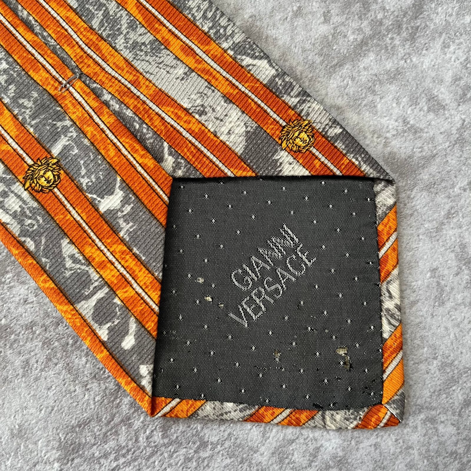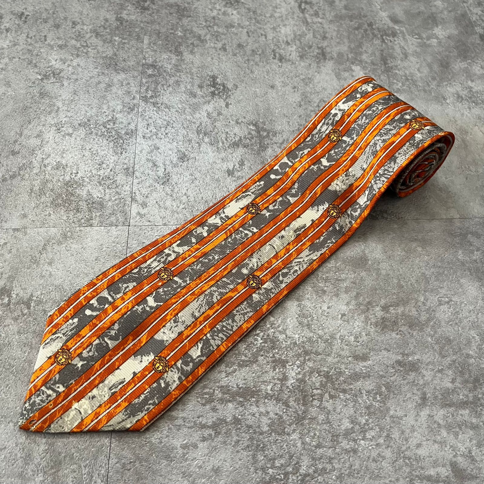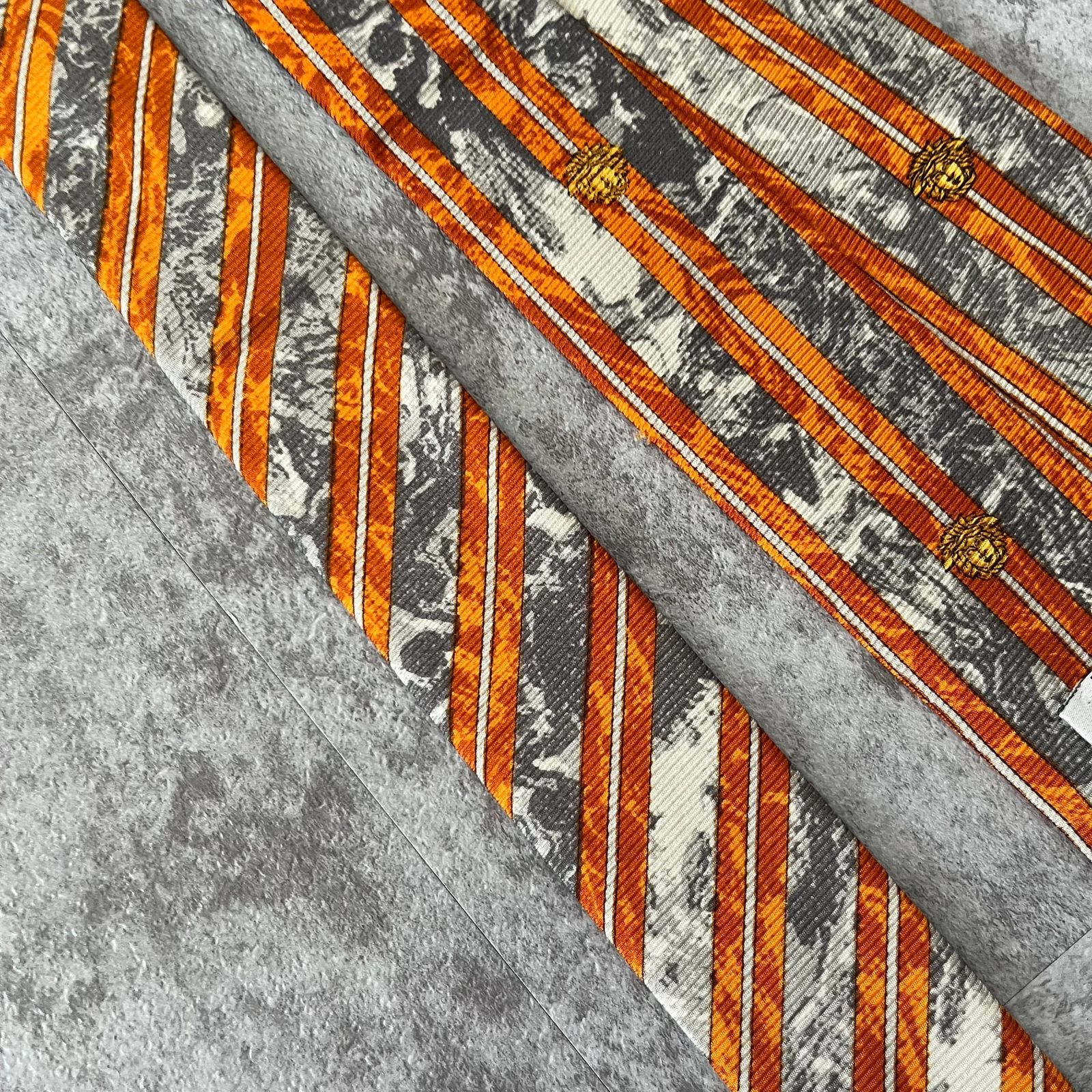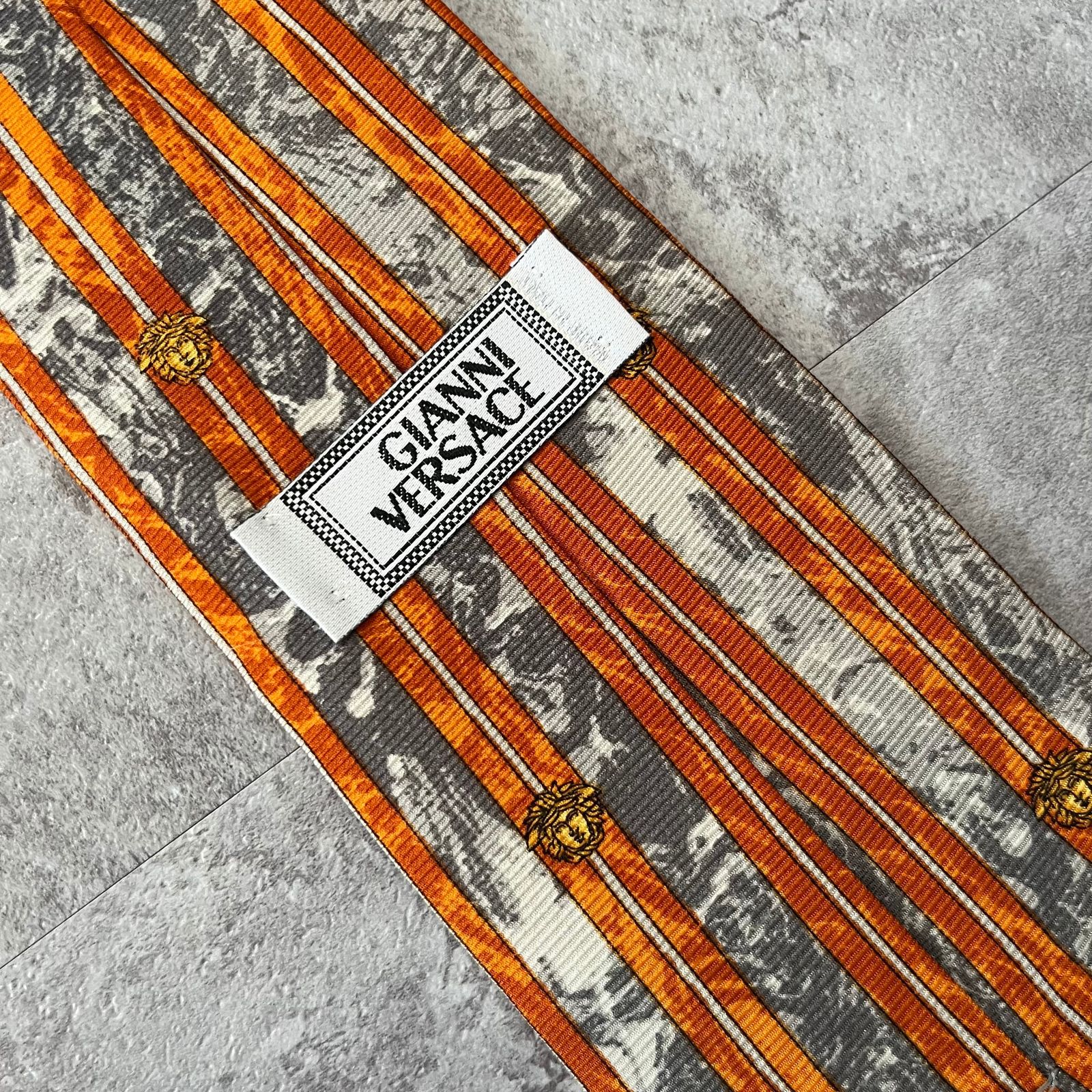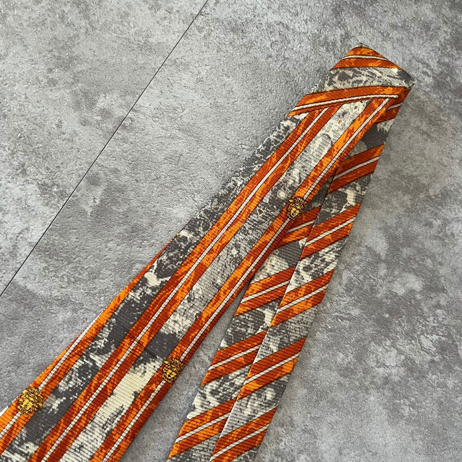 【Versace】バイカラーストライプネクタイ グレー×オレンジ ロゴ入り メデューサロゴ