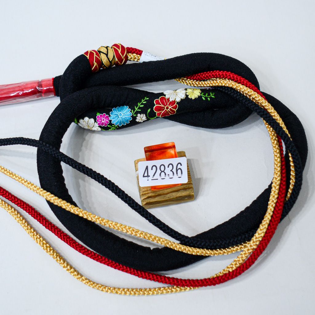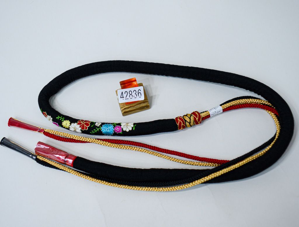 帯締め 正絹 丸ぐけ 刺繍 花柄 中綿入り 豪華金糸入 黒色 振袖 浴衣 NO42836