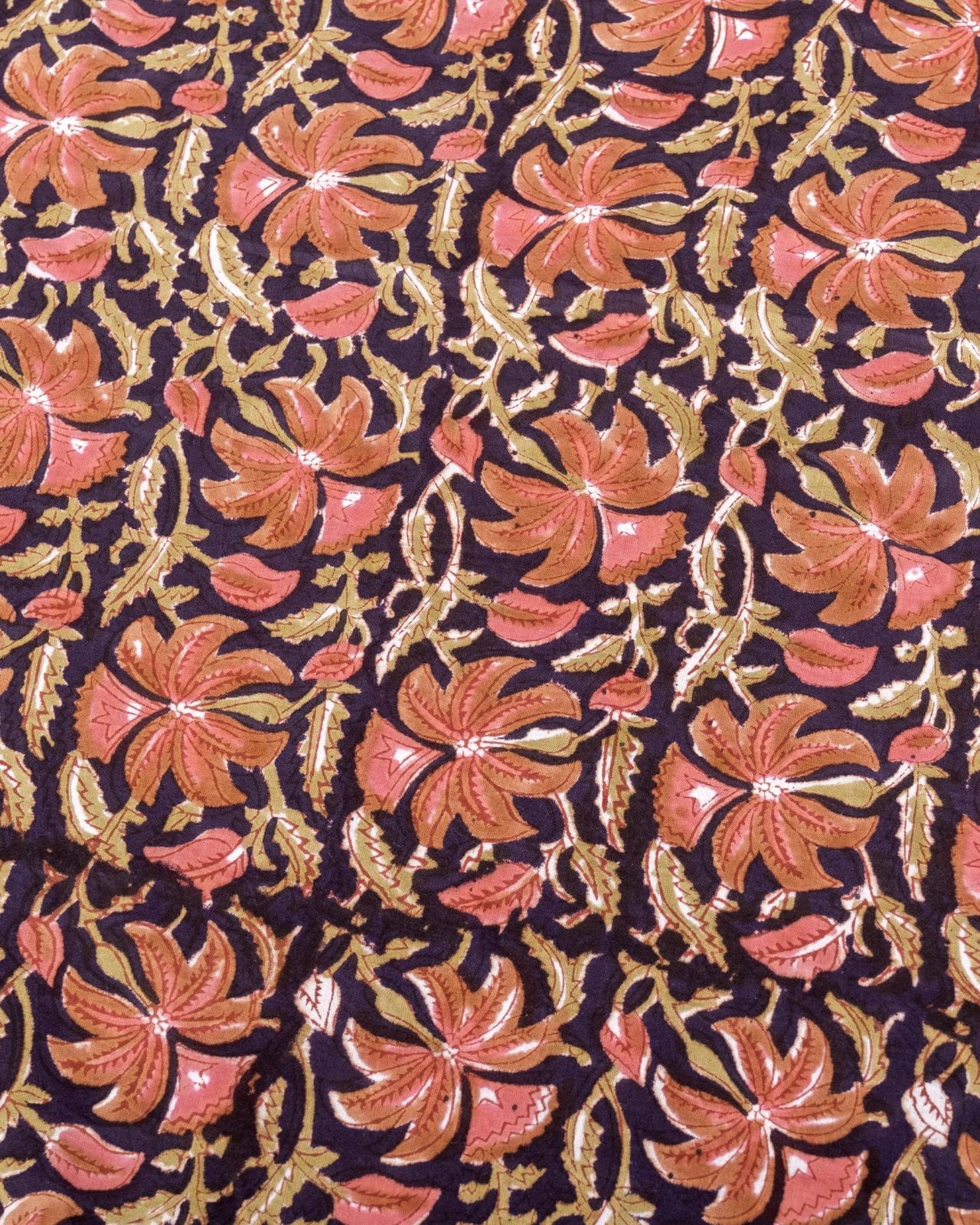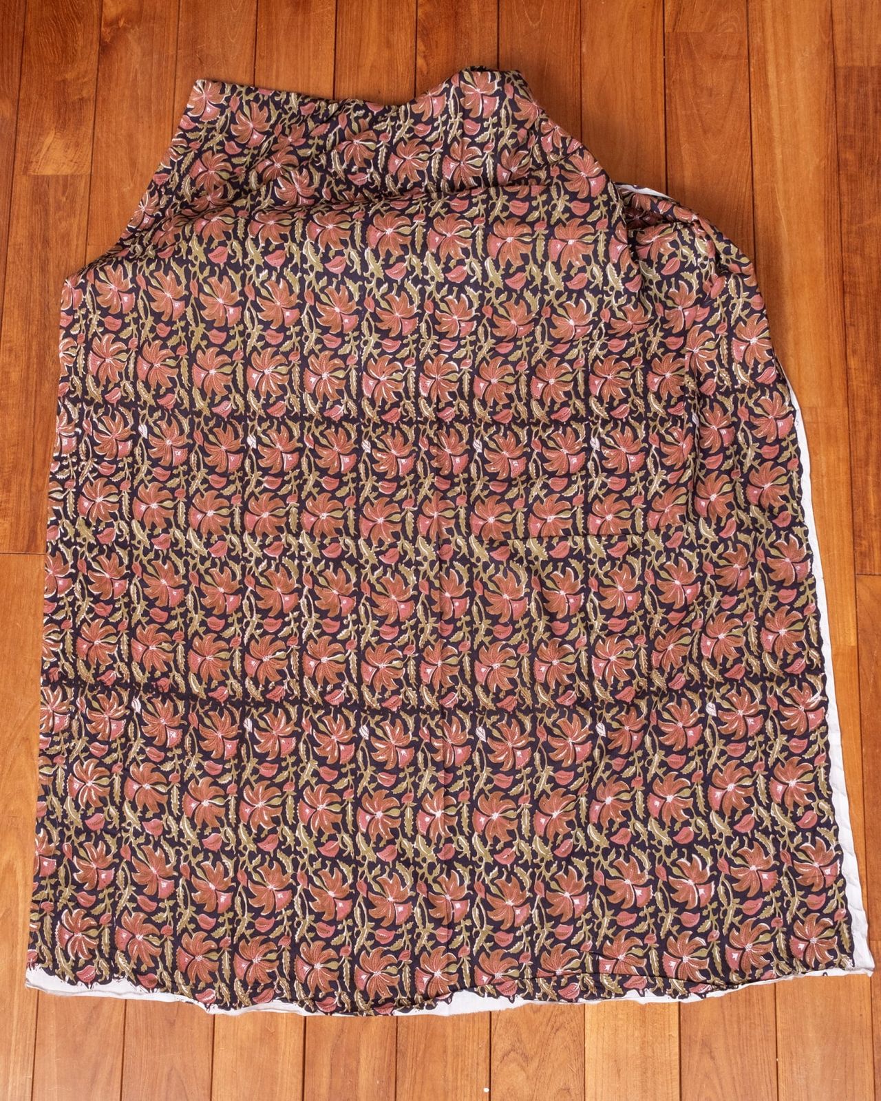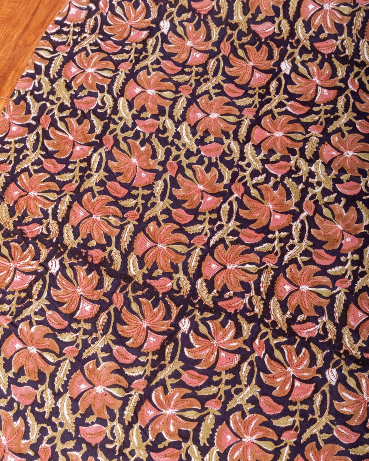 木版染めとは、ウッドブロック(木版)を用いて一つ一つ模様を染めこんだ優雅で贅沢な仕上がりの布です。大量生産には向かない、非常に時間のかかる丁寧な手仕事の賜物といえます。インドは美しい布の宝庫ですが、その中でも特に素敵な一枚に仕上がっています。